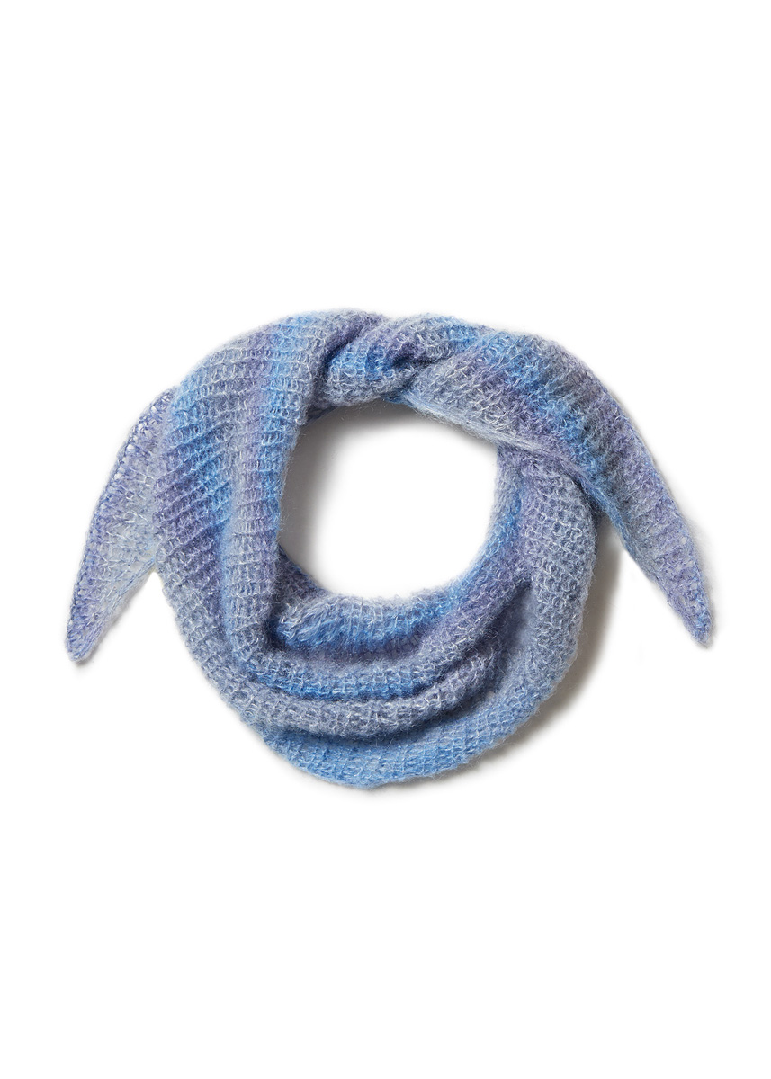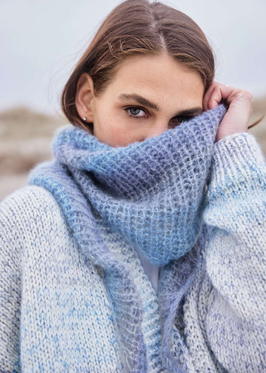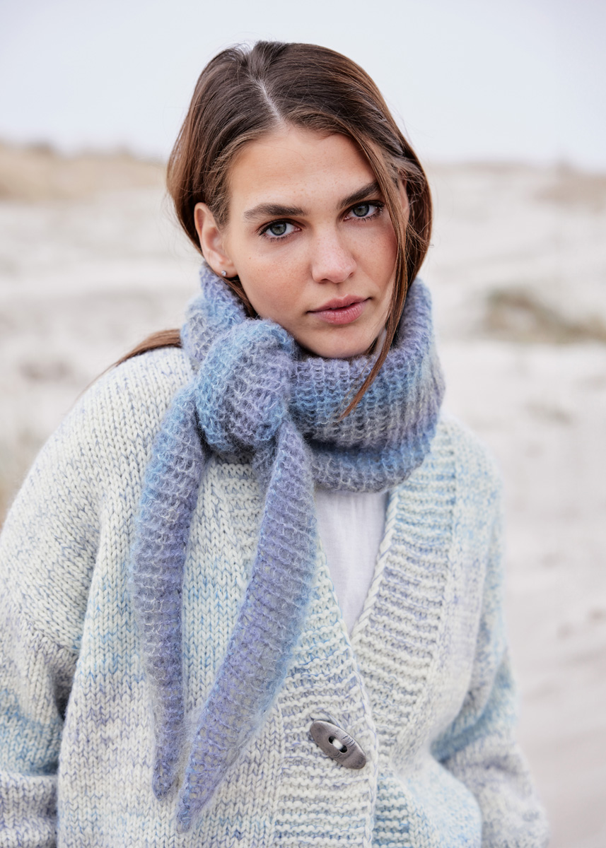 50 g of Lana Grossa Silkhair Print (70% superkid mohair, 30% silk; 210 m/25 g) in Light Grey/Grey Purple/ Jeans/Grey Blue (col 431). Size 5.5 mm needles.