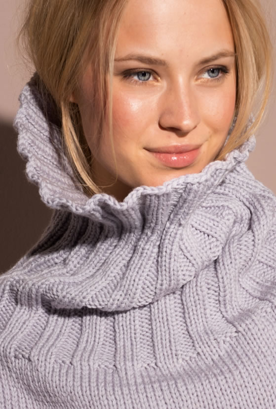 550 (600, 650) g of Lana Grossa Cool Wool Cashmere (90% extrafine Merino wool, 10% cashmere; 50 g = 160 m) in Pale Purple (col 1). Size 8 and 9 mm needles; size 8 mm circular needle, 60 cm long.