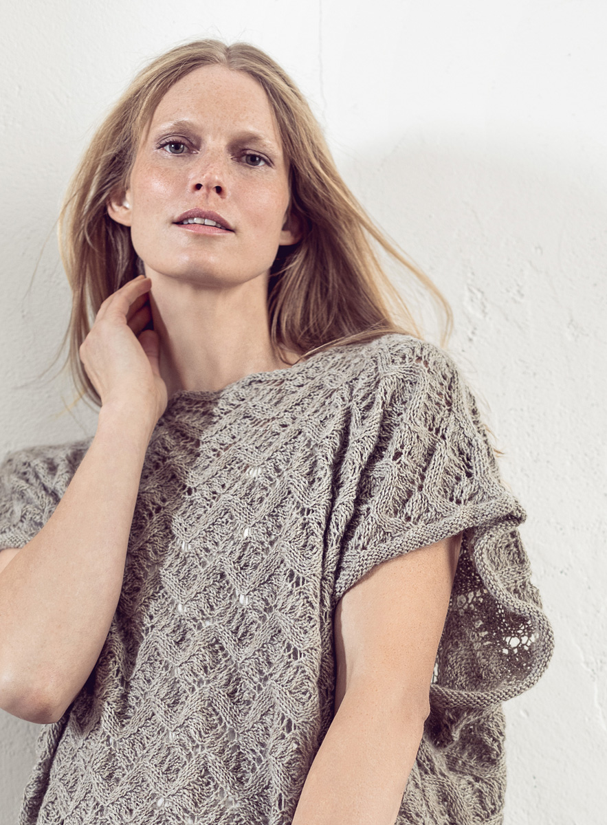 300 (350, 400) g of Lana Grossa Ecopuno (72% cotton, 17% Merino wool, 11% baby alpaca; 215 m/50 g) in Khaki (col 27). Size 3 and 3.5 mm needles; size 3 mm crochet hook