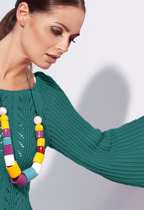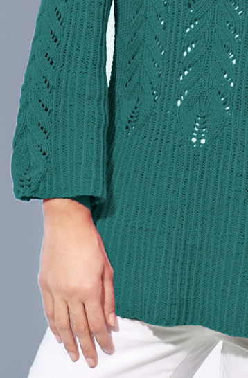 Approx. 500 (550) g of Lana Grossa Elastico (96% cotton, 4% polyester [Elité]; 160m/50g) in Petrol (col 122); size 3.5 mm needles; size 3.25 mm crochet hook.