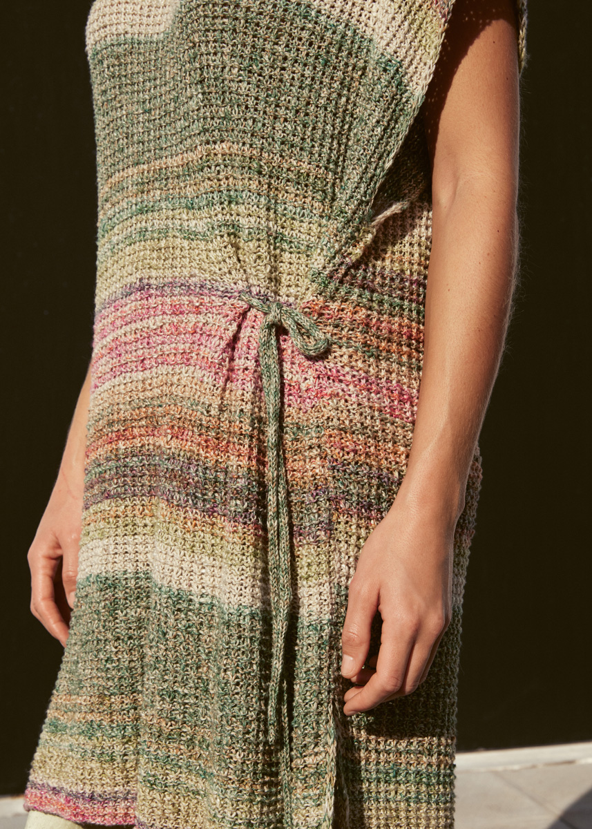 500 (500, 600) g of Lana Grossa Mosaico (54% cotton, 23% linen, 23% viscose; 270 m/100 g) in Grey Beige/ Carnation/Orange/Dark Grey/Reed Green/Petrol Green/Grey Green/Ochre (col 8). Size 4 mm needles; 2 size 4 mm double- pointed needles [dpns]; one 1.5 cm button