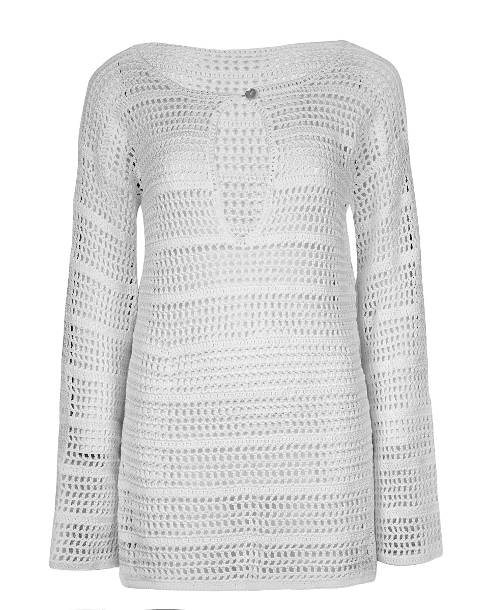 450 (500, 550) g of Lana Grossa Prima (100% combed, mercerized, gassed cotton; 140 m/50 g) in White (col 22). Size 3.5 mm hook; one button