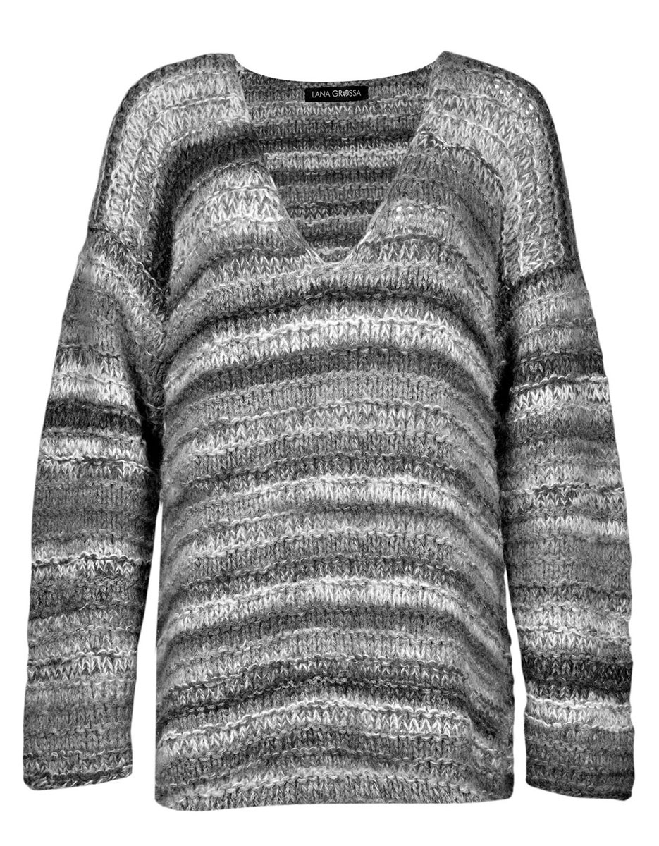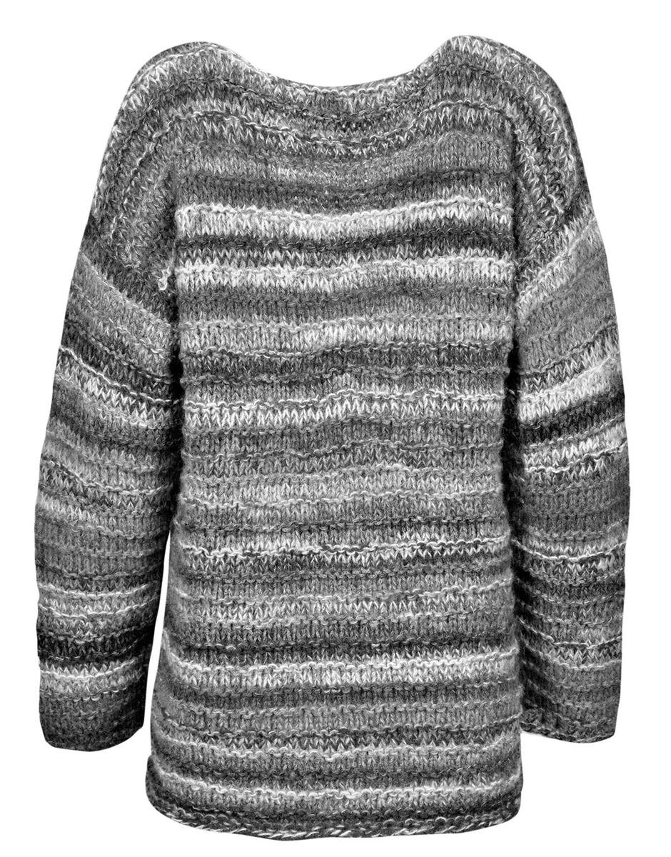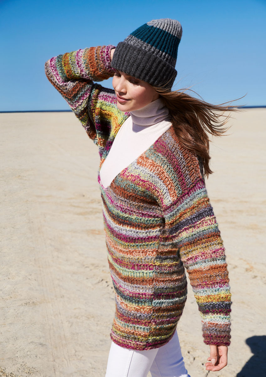 100 g each of Lana Grossa Fatto (62% Merino wool, 26% mohair, 12% polyamide; 175 m/50 g) in Light Grey (col 9), Dark Orange (col 13), Cyclamen (col 15) and Mint Turquoise (col 5) and 300 g of Lana Grossa Tutti (30% polyamide, 25% mohair, 25% superfine alpaca, 20% Merino wool; 330 m/100 g) in Yellow/White/Orange/Light Grey/Grey-Brown (col 11). Size 9 mm needles.