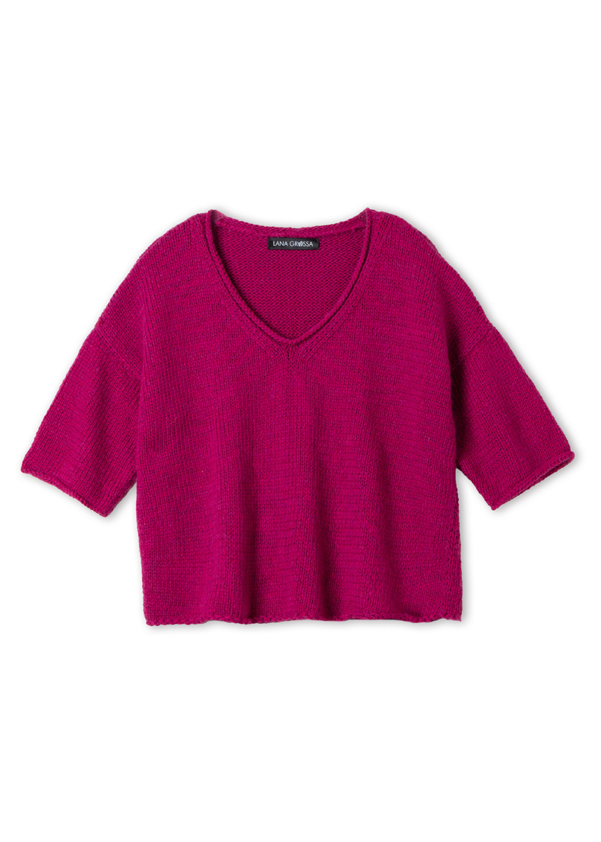 300 (300, 350, 350) g of Lana Grossa Summer Softness (80% organic cotton, 20% superfine Merino wool; 130 m/50 g) in Fuchsia (col 27). Size 5 and 6 mm needles; short size 5 mm circular needle.