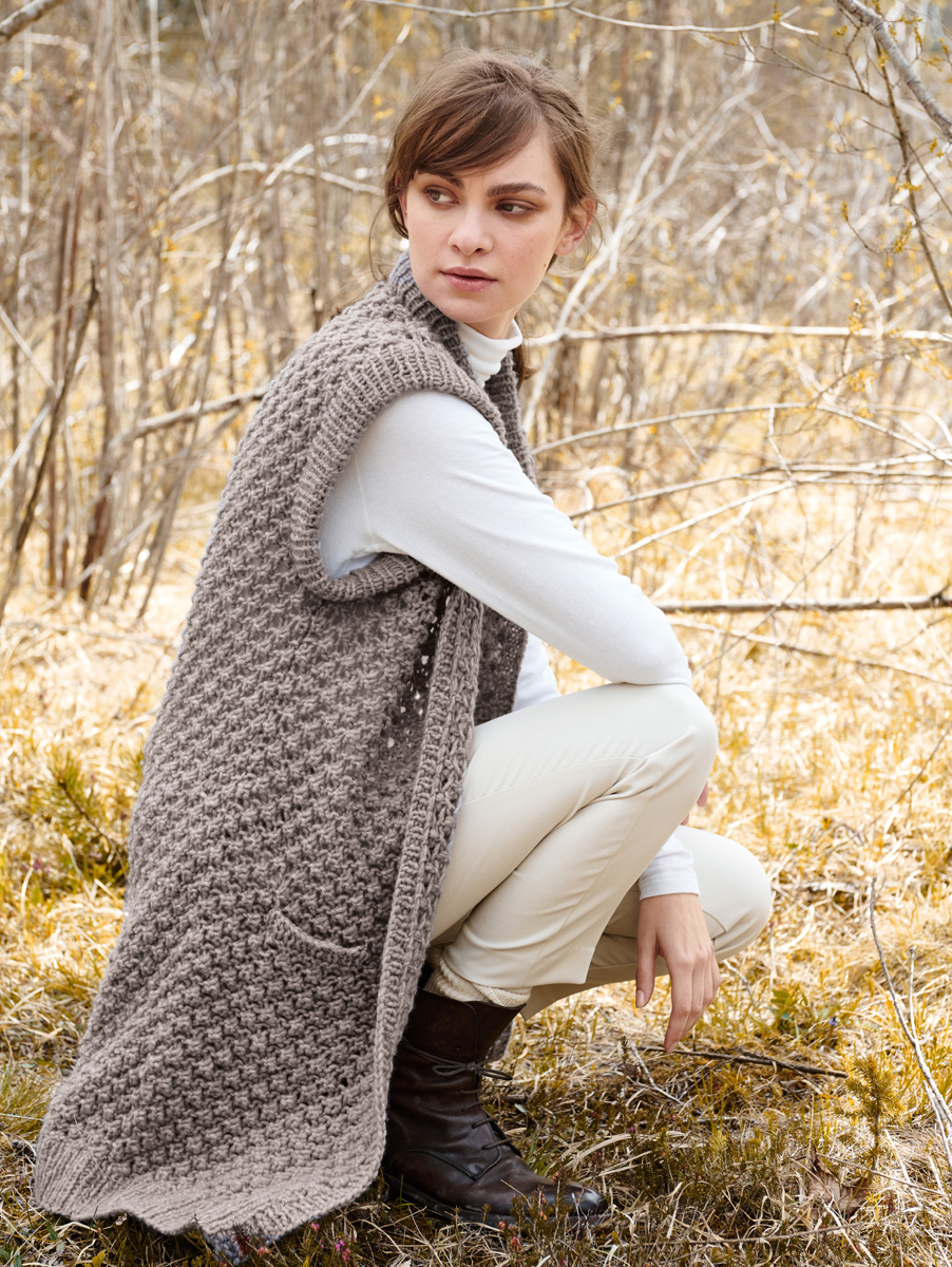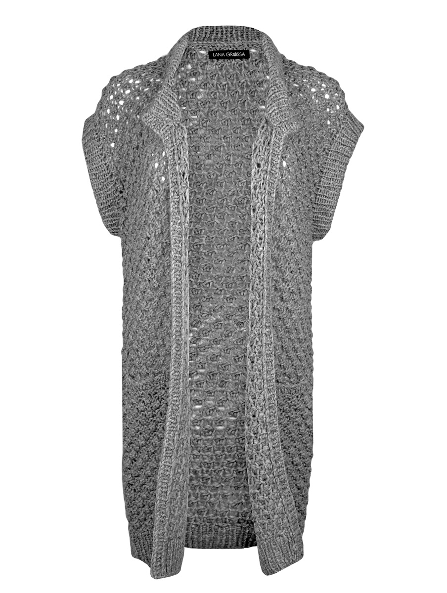 350 (400, 450, 500) g of Lana Grossa Cool Air (55% Merino wool, 33% baby alpaca, 12% polyamide; 125 m/50 g) in Greige (col 2). Size 7 and 9 mm needles; size 7 mm circular needle, 40 cm long