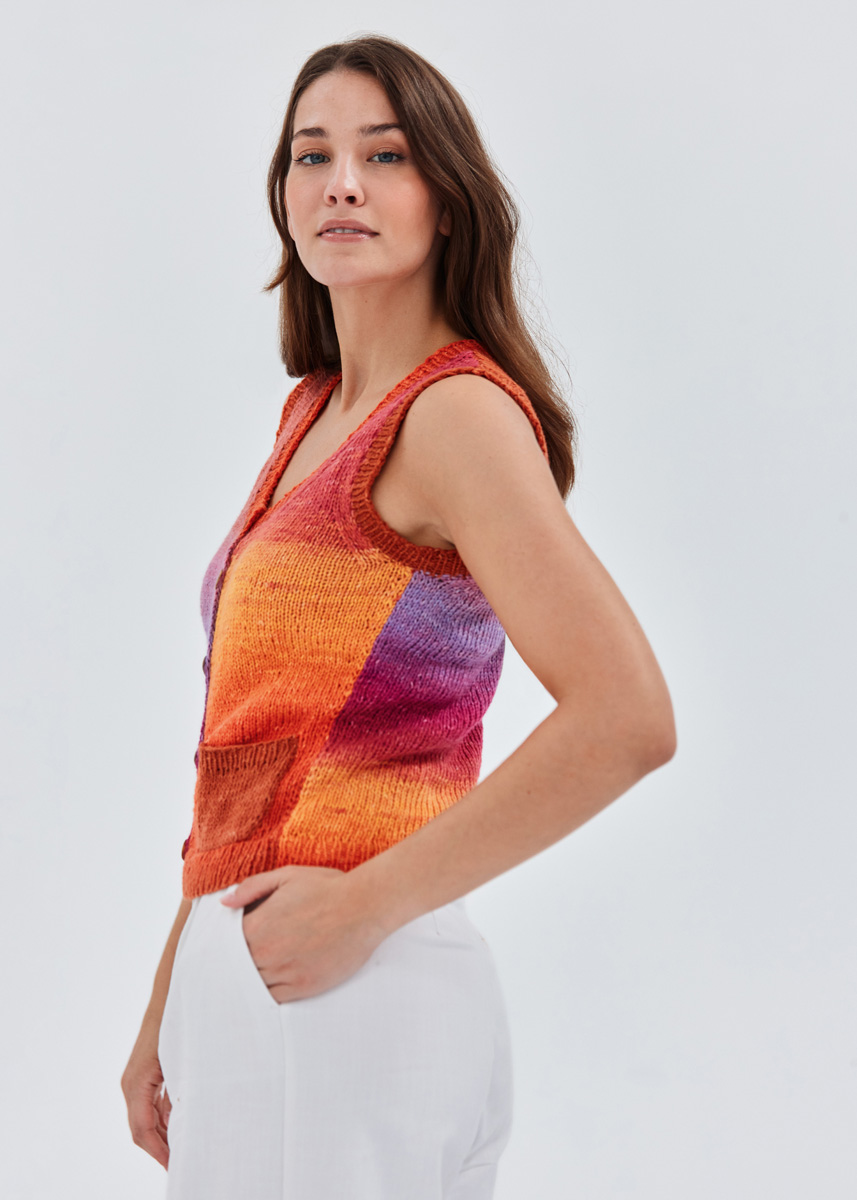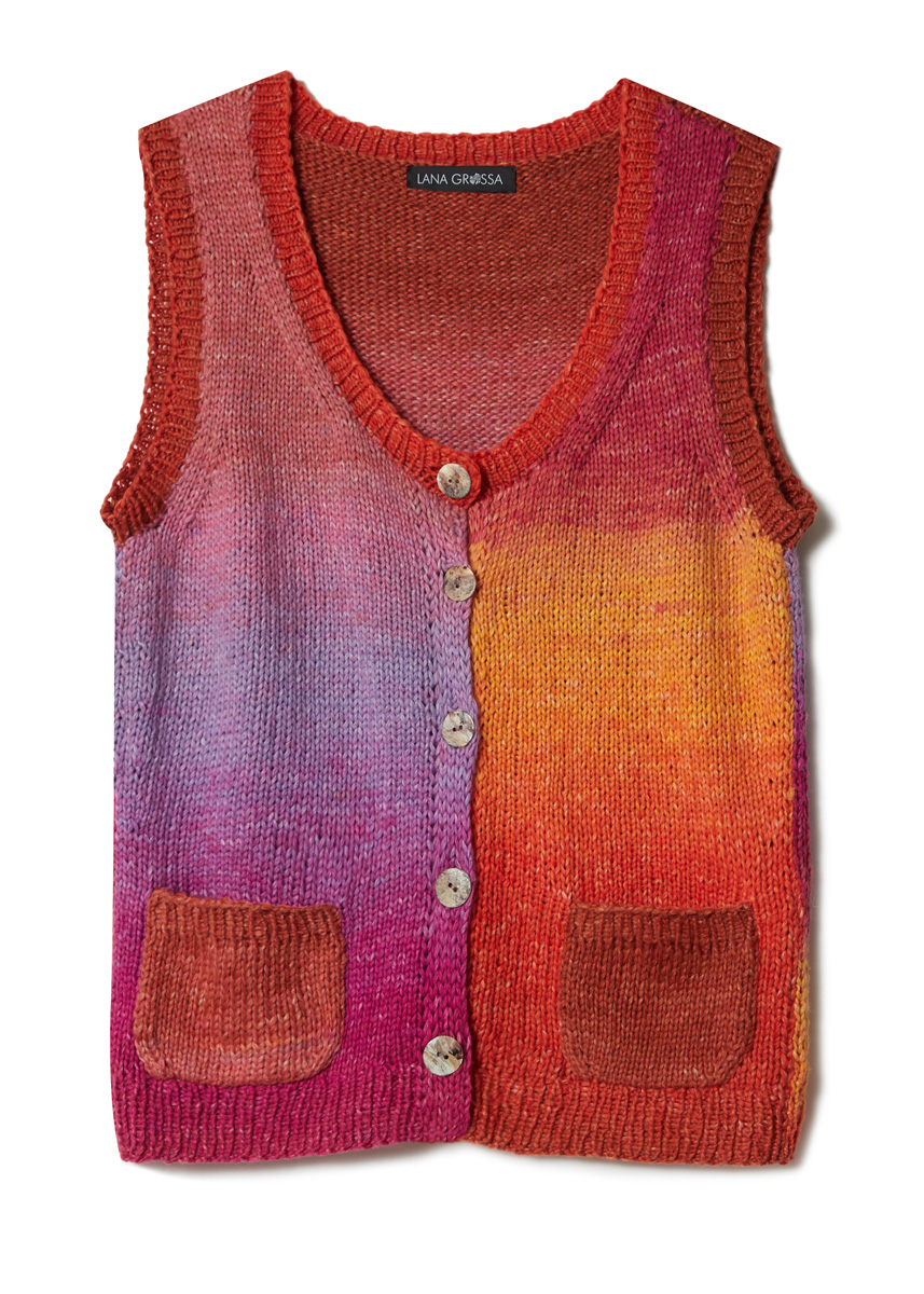 200 (200, 300, 300) g of Lana Grossa Cotonella (100% Pima cotton; 280 m/100 g) in Wine/Orange/Red/Fire/ Terracotta/Brick/Pink/Purple (col 4). Size 3 and 5 mm needles; size 3 mm circular needle; five 20 mm mother-of-pearl buttons [by Union Knopf, item 37604].