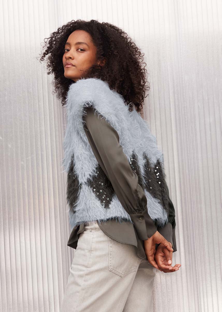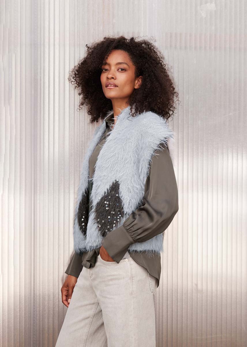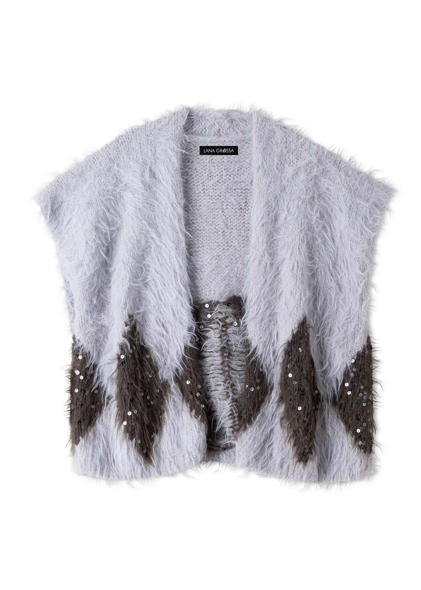 100 (150) g of Lana Grossa Ecopuno (72% cotton, 17% Merino wool, 11% baby alpaca; 215 m/50 g) in Silver Grey (col 45); 250 (300) g of Lana Grossa Basta (50% Merino wool, 50% polyamide; 100 m/50 g) in Silver Grey (col 4); 100 g of Lana Grossa Cosmo (100% cotton (with sequins); 260 m/100 g) in Grey (col 3). Size 7 mm needles; 4 stitch holders.