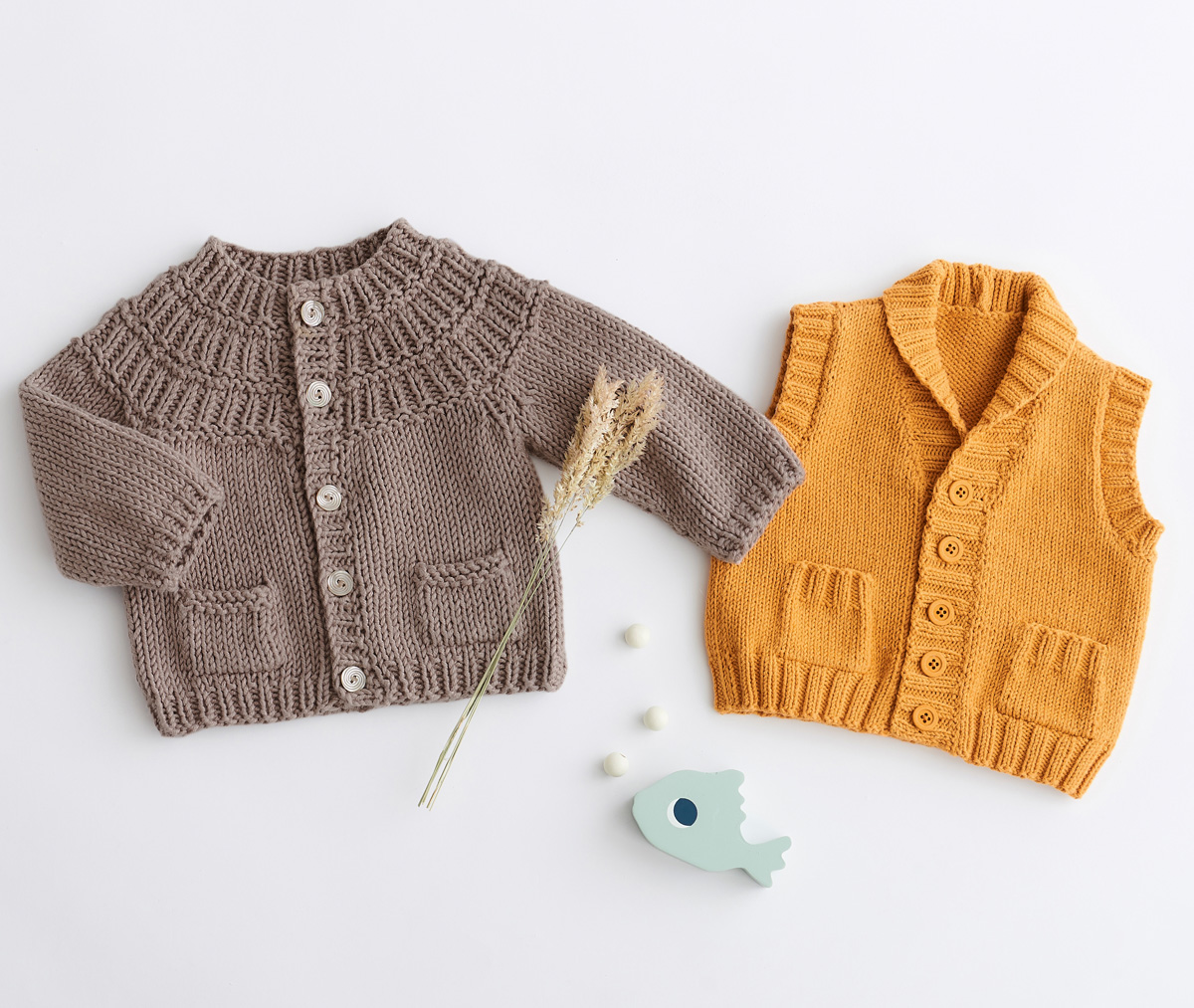The model packages do not include any needles, buttons and accessoires, but knitting patterns are delivered by email or in printed form without extra costs.