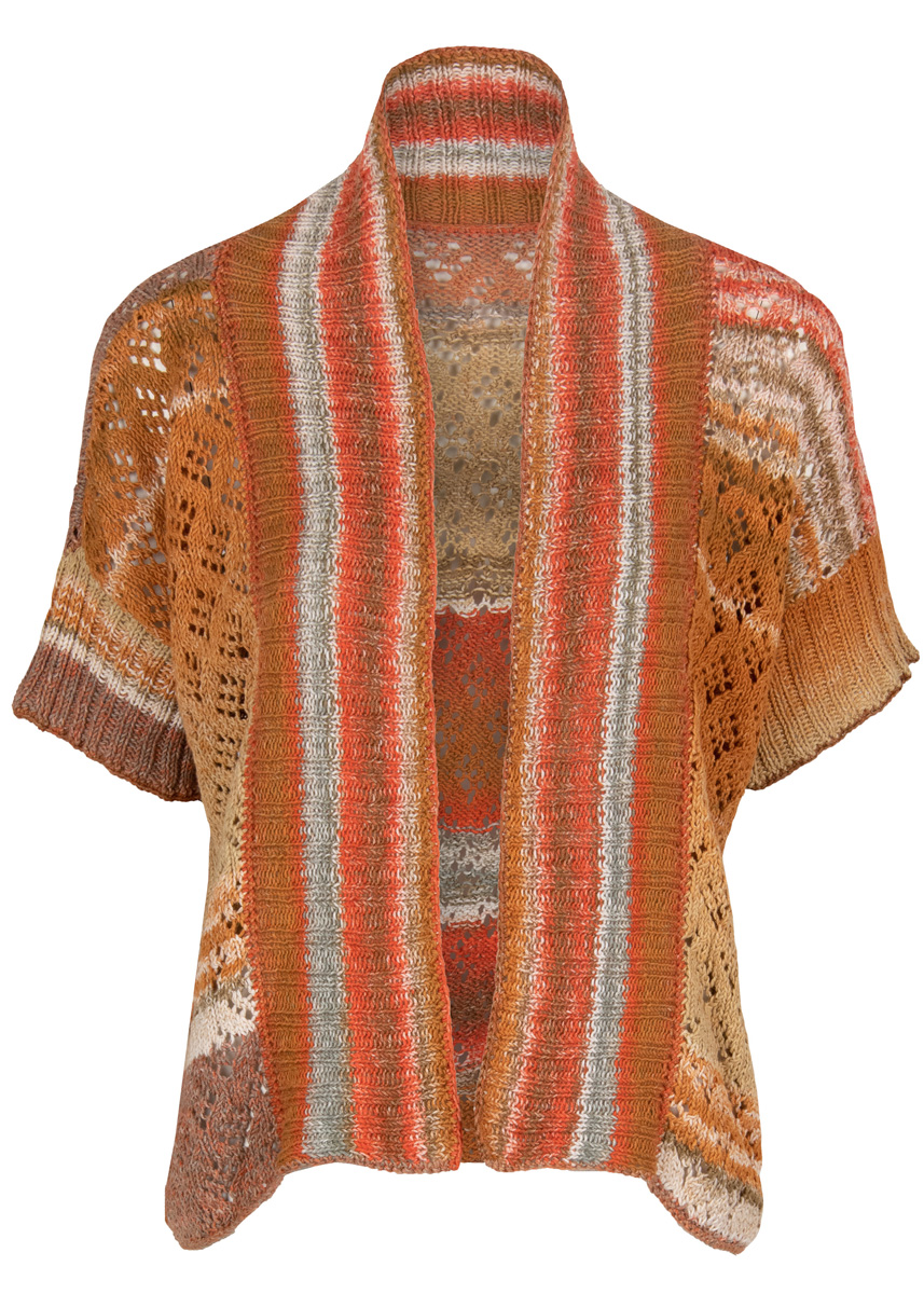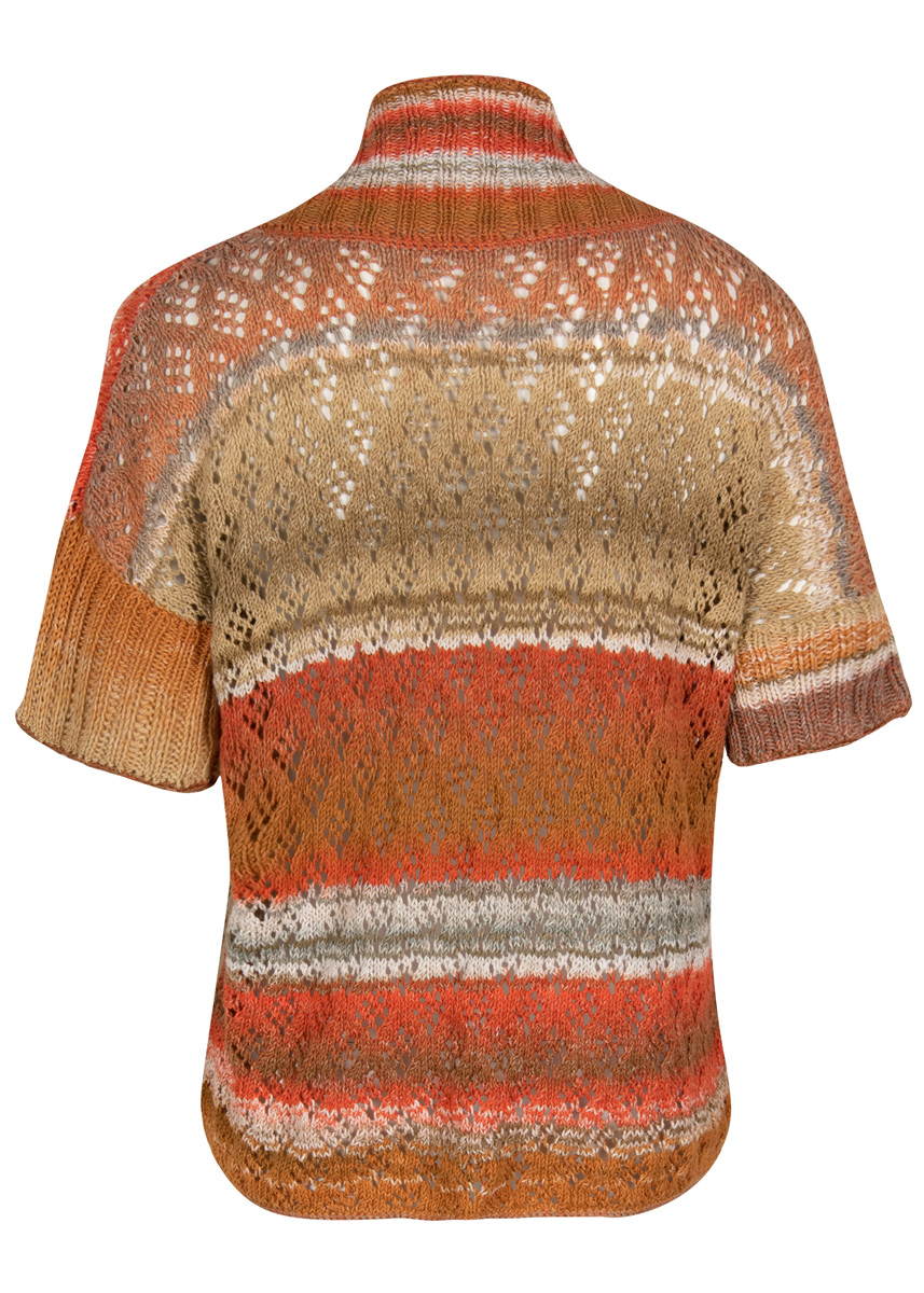 400 (400, 600) g of Lana Grossa Gomitolo Denim Inca (80% cotton, 20% polyamide; 740 m/200 g) in Orange-/Gold-Brown/Natural/Grey/White/Nougat/Beige/Nut Brown (col 158). Size 4 mm needles; size 3.5 mm circular needle, 80 cm long; one set size 3.5 mm double-pointed needles [dpns]; size 3.5 mm crochet hook