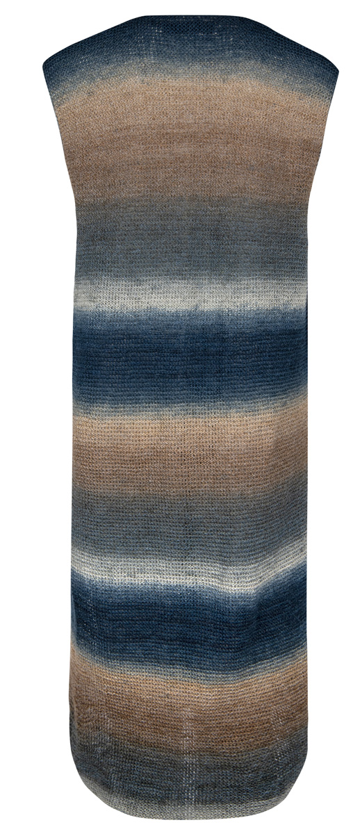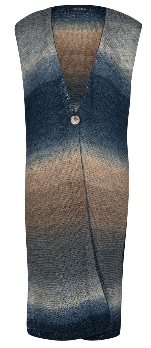 500 (500, 600) g of Lana Grossa Mare (46% linen, 33% silk, 21% cotton; 330 m/100 g) in Dark-/Light Grey/Grey Blue/Midnight Blue/Grey Beige/Taupe (col 5). Size 3.5 mm needles; size 3.5 mm crochet hook; one 30 mm mother-of-pearl button.