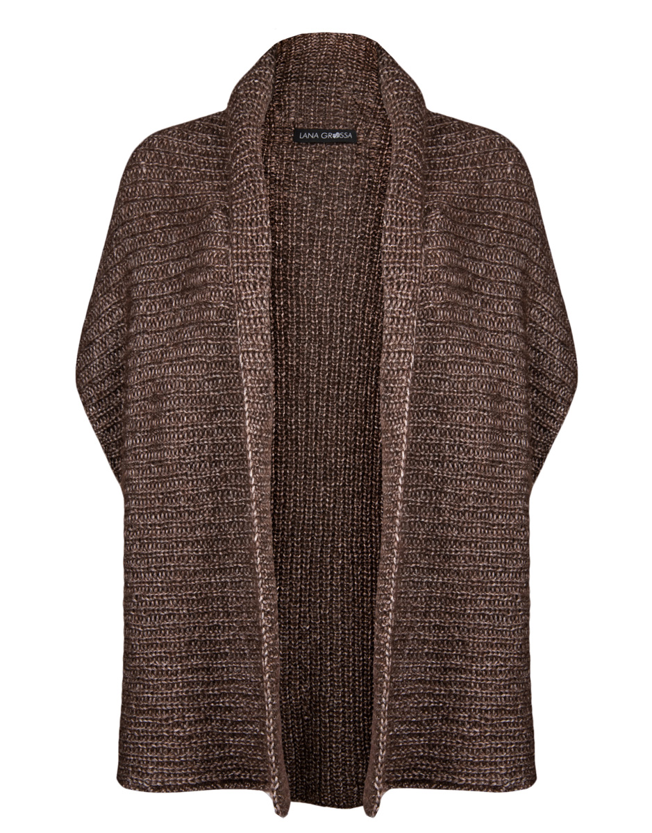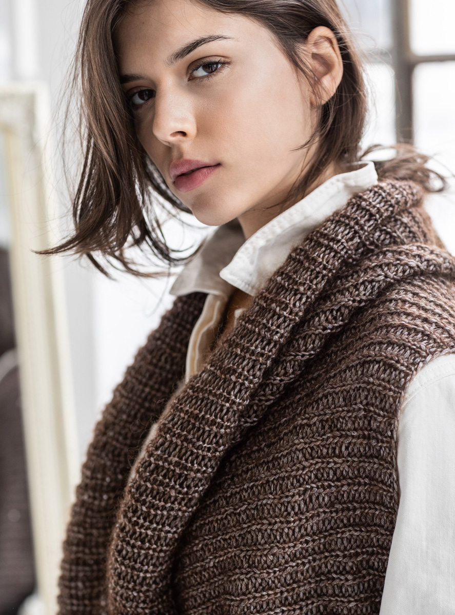 250 (275, 300) g of Lana Grossa Mia (30% mohair, 26% pure wool, 25% silk; 19% polyamide; 105 m/25 g) in Brown (col 9). Size 6 mm needles