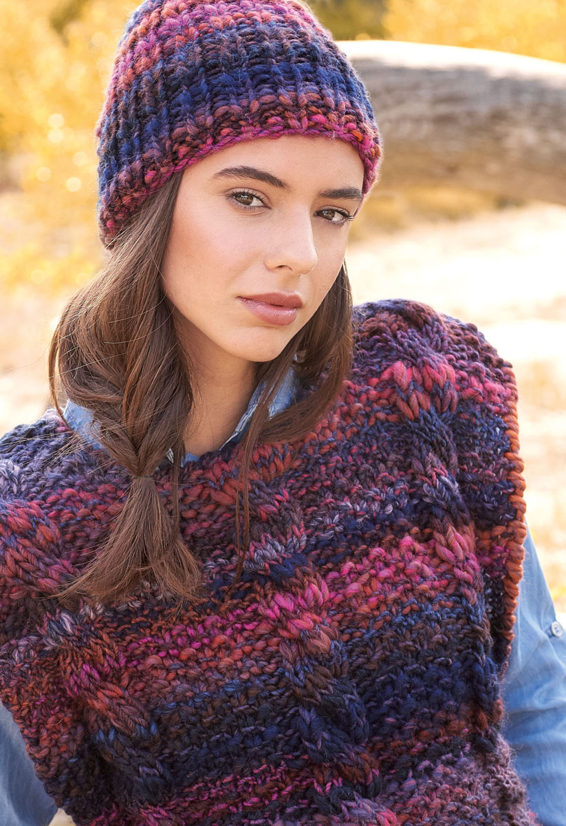 400 g of Lana Grossa Olympia (53% pure wool, 47% acrylic; 100 m/100 g) in Dark Blue/Orange/Pink/Grey-Blue/Red/Blue (col 67). Size 12 mm needles; size 6 mm crochet hook