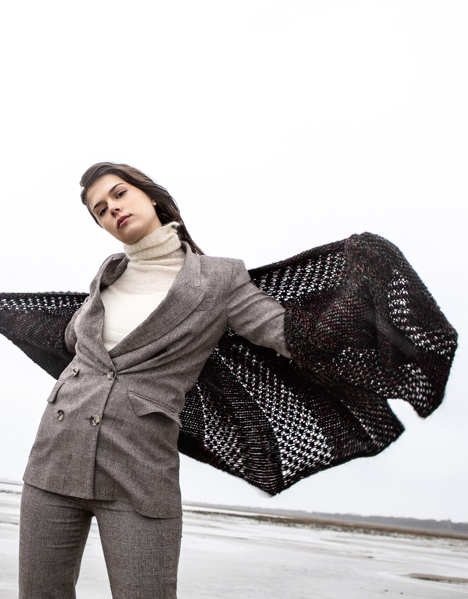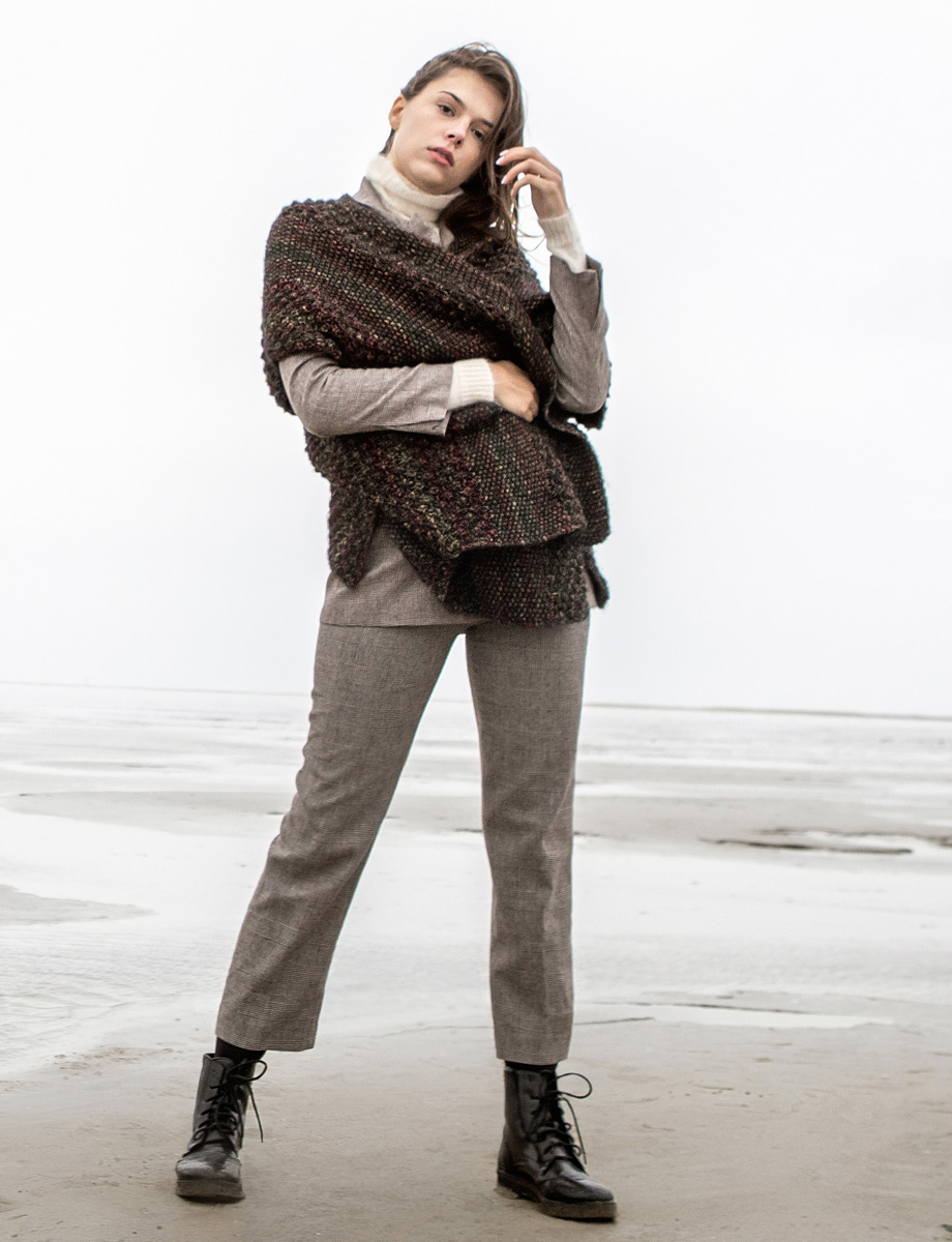 350 (400, 450) g of Lana Grossa Piuma (75% pure wool, 15% alpaca, 10% polyamide; 140 m/50 g) in Olive/ Rosewood/Dark Grey/Black (col 11). Size 8 needles