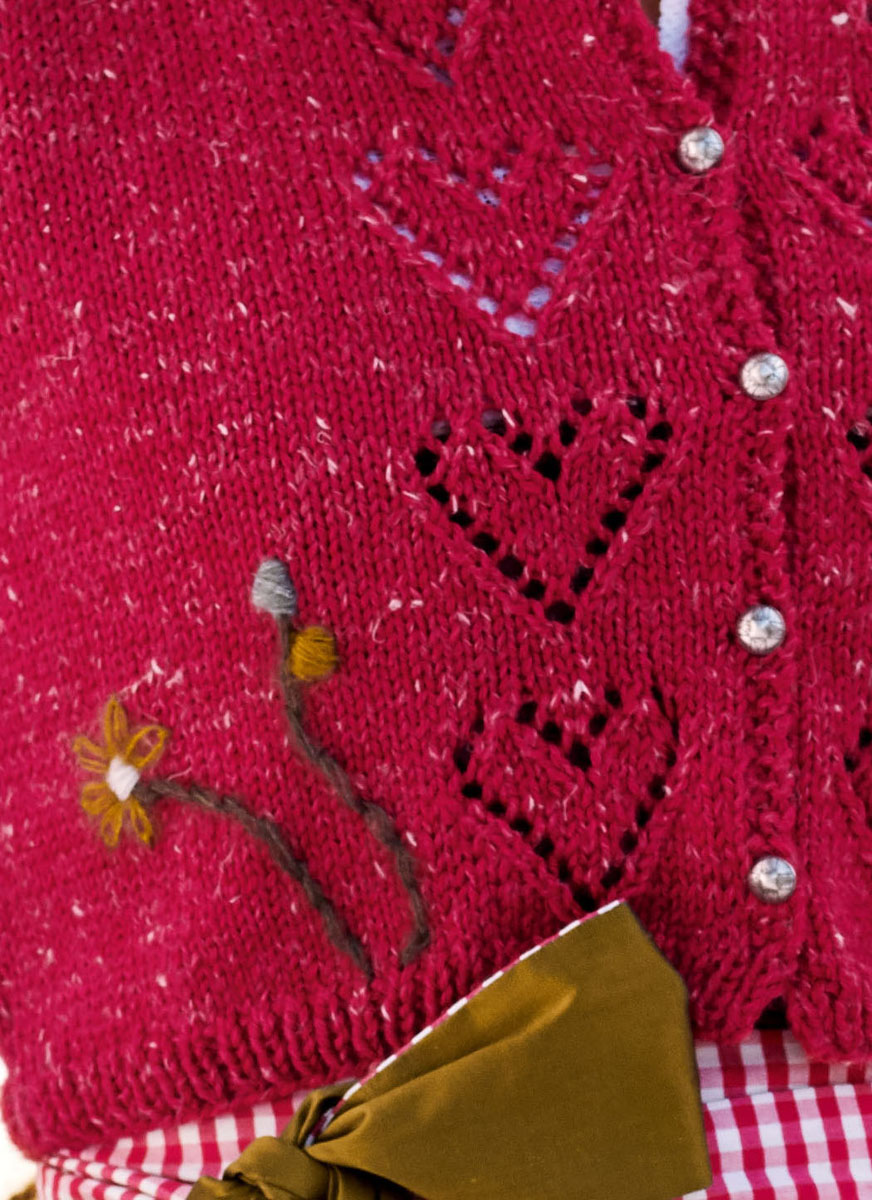 200 (250, 300) g of Lana Grossa Slow Wool Canapa (90% pure wool, 10% hemp; 100 m/50 g) in Red (col 11) and 25 g each of Lana Grossa Silkhair (70% superkid mohair, 30% silk; 210 m/25 g) in Light Olive (col 108), Moss (col 127), Pearl White (col 97) and Dark Olive (col 111). Size 4.5 mm needles; size 4.5 mm circular needle, 40 cm long; six 11 mm buttons [by Union Knopf, item 452287, col 83]