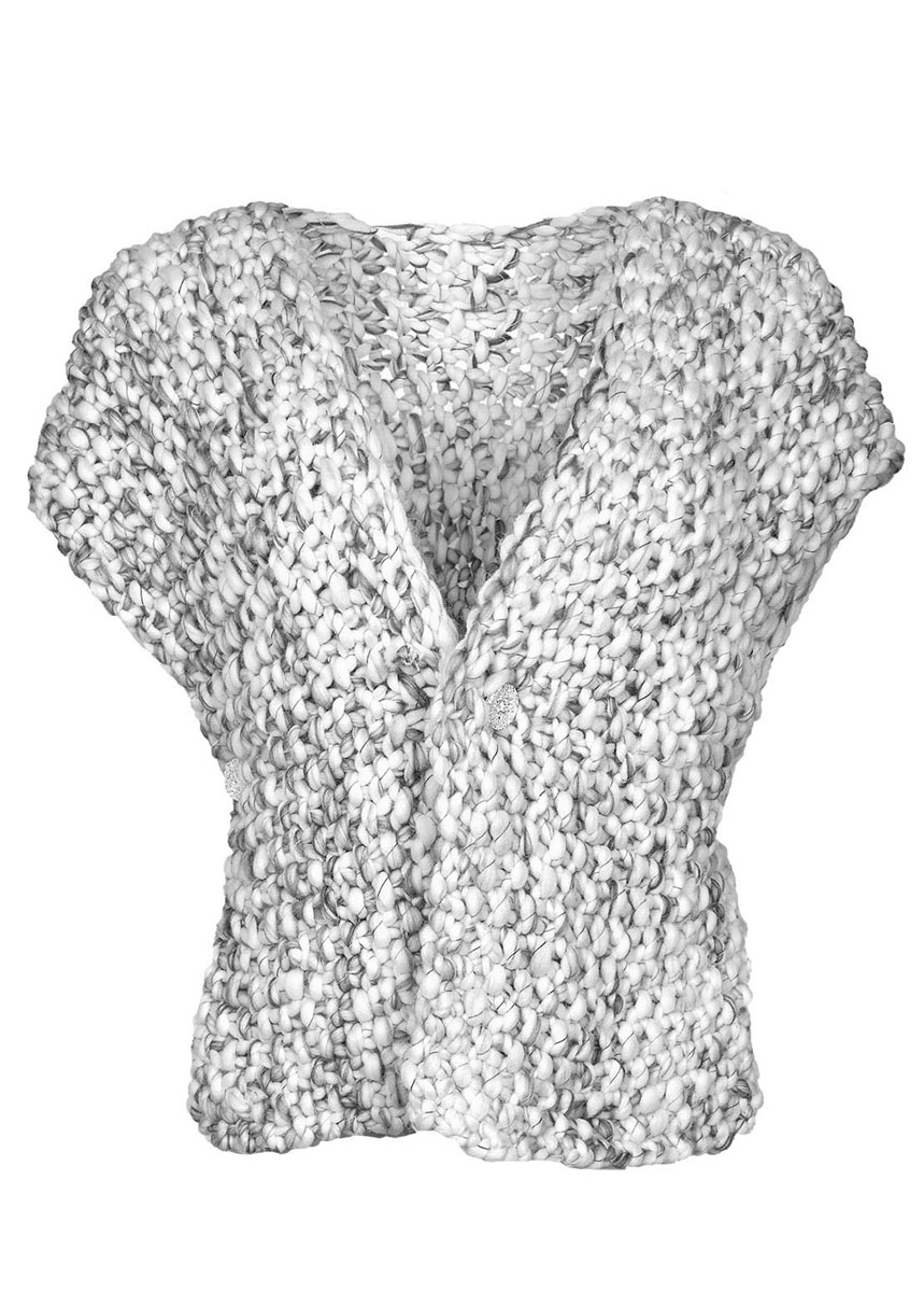 500 (600) g of Lana Grossa Weekend Color (69% extrafine Merino wool, 30% baby alpaca, 1% cotton; 35 m/100 g) in Natural/Olive/Grey-Brown (col 105). Size 15 mm circular needle, 100 cm long; three 25 mm mother-of-pearl buttons [by Union Knopf, item 453121, col 14]