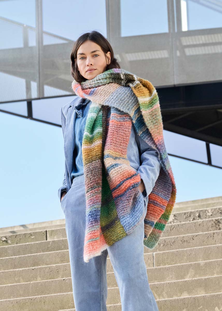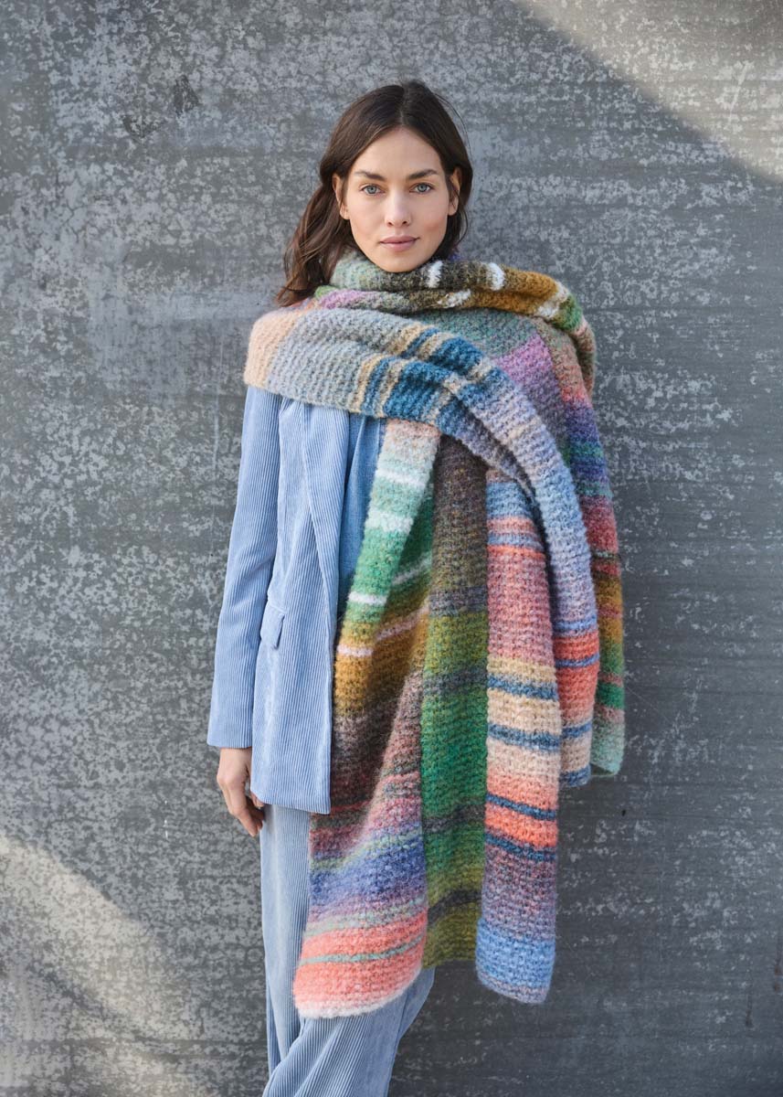 100 g each of Lana Grossa Gigante Multi (70% fine alpaca, 30% polyamide; 150 m/50 g) in Grey Blue/Beige/ Grey Red/Mandarin/Petrol Green/Grey Yellow (col 101), Grey Green/Red Violet/Dark Jeans/Yellow Orange/Geranium Pink/ Olive/Moss Green (col 105) and Dark Olive/Light Olive/Pink/ Grey Green/Green/Blackberry/Antique Violet (col 106). Size 6.5 mm needles.