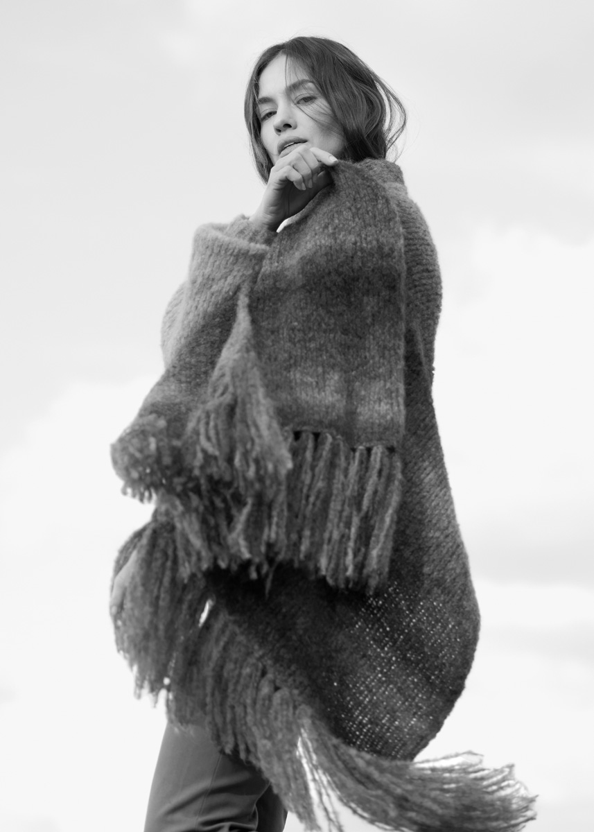 300 g of Lana Grossa Avio (63% fine alpaca, 37% polyamide; 150 m/50 g) in Grey/Charcoal (col 8). Size 5 mm needles; crochet hook for fringe
