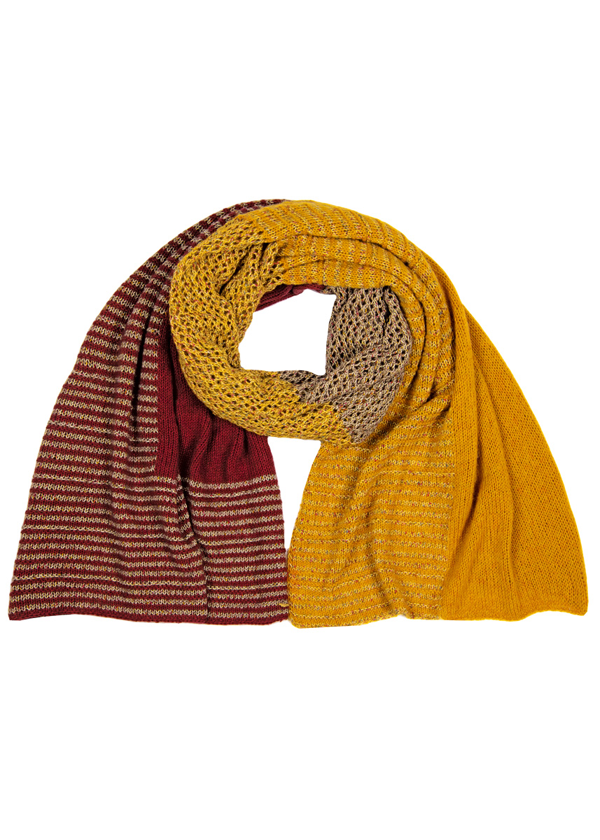 100 g each of Lana Grossa Ecopuno Print (72% cotton, 17% Merino wool, 11% baby alpaca; 215 m/50 g) in Grey Brown Print (col 106) and Curry Print (col 107); 100 g each of Lana Grossa Ecopuno (72% cotton, 17% Merino wool, 11% baby alpaca; 215 m/50 g) in Brown Red (col 31) and Yellow Orange (col 33). Size 4 and 4.5 mm needles