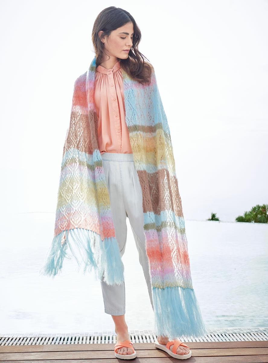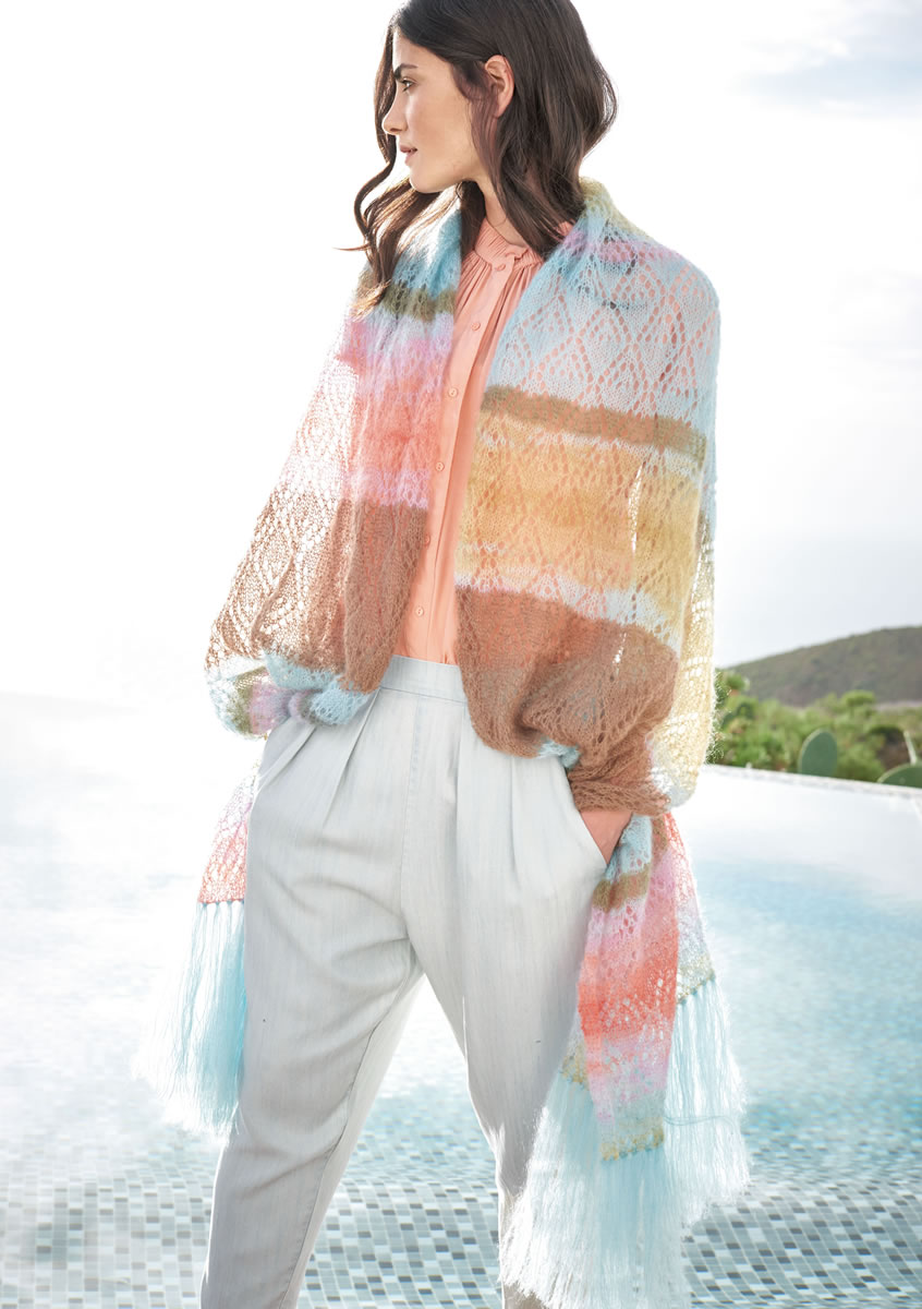 75 g of Lana Grossa Silkhair (70% superkid mohair, 30% silk; 210 m/25 g) in Light Turquoise (col 82), 50 g in Light Brown (col 24) and 25 g in Khaki (col 60) and 100 g of Lana Grossa Silkhair Print (70% superkid mohair, 30% silk; 400 m/50 g) in Ice Blue/Lilac/Light Olive/Orange-Red (col 345). Size 5.5 mm needles; size 4.5 mm crochet hook
