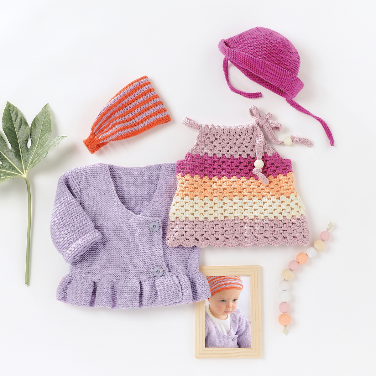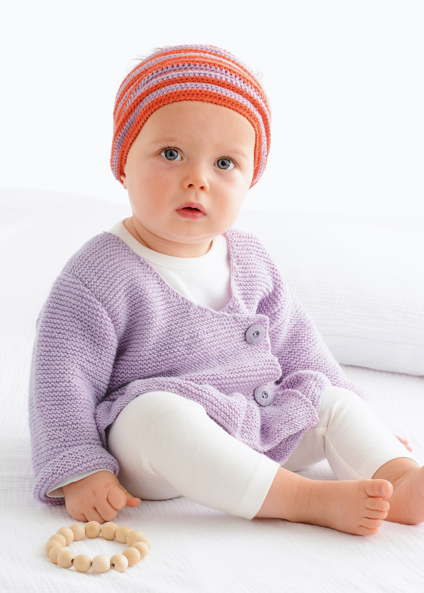 100 (150, 150, 200, 200) g of Lana Grossa Cool Wool Baby (100% pure wool; 220 m/50 g) in Lilac (col 268). Size 3 mm needles; size 2.5 mm crochet hook; 1 (2, 2, 2, 2) 20 mm button(s); 1 (2, 2, 2, 2) 10 mm transparent snap button(s).