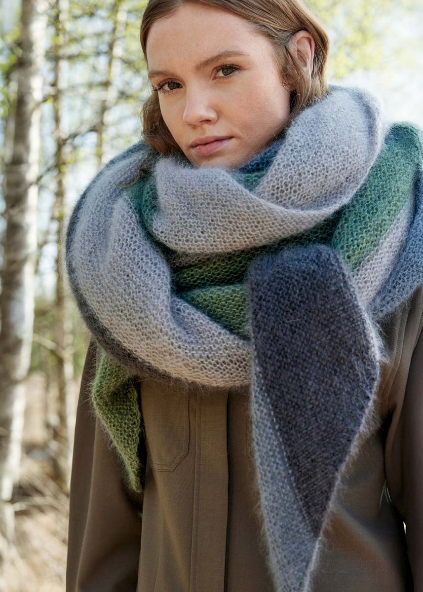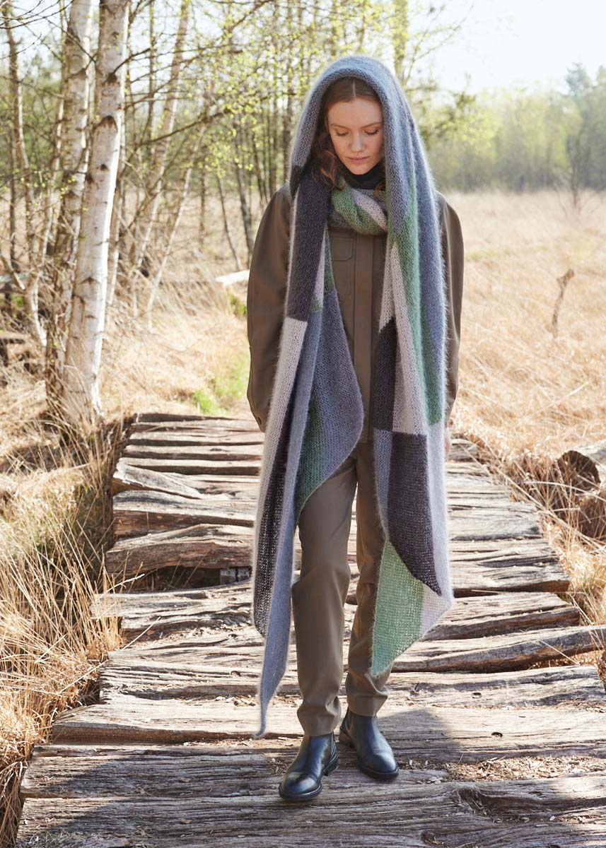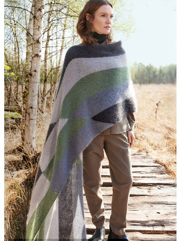 100 g each of Lana Grossa Silkhair (70% superkid mohair, 30% silk; 210 m/25 g) in Grey Beige (col 184), Dark Grey (col 12), Charcoal (col 183) and Moss Green (col 127). Size 5.5 mm circular needle, 120 cm long.