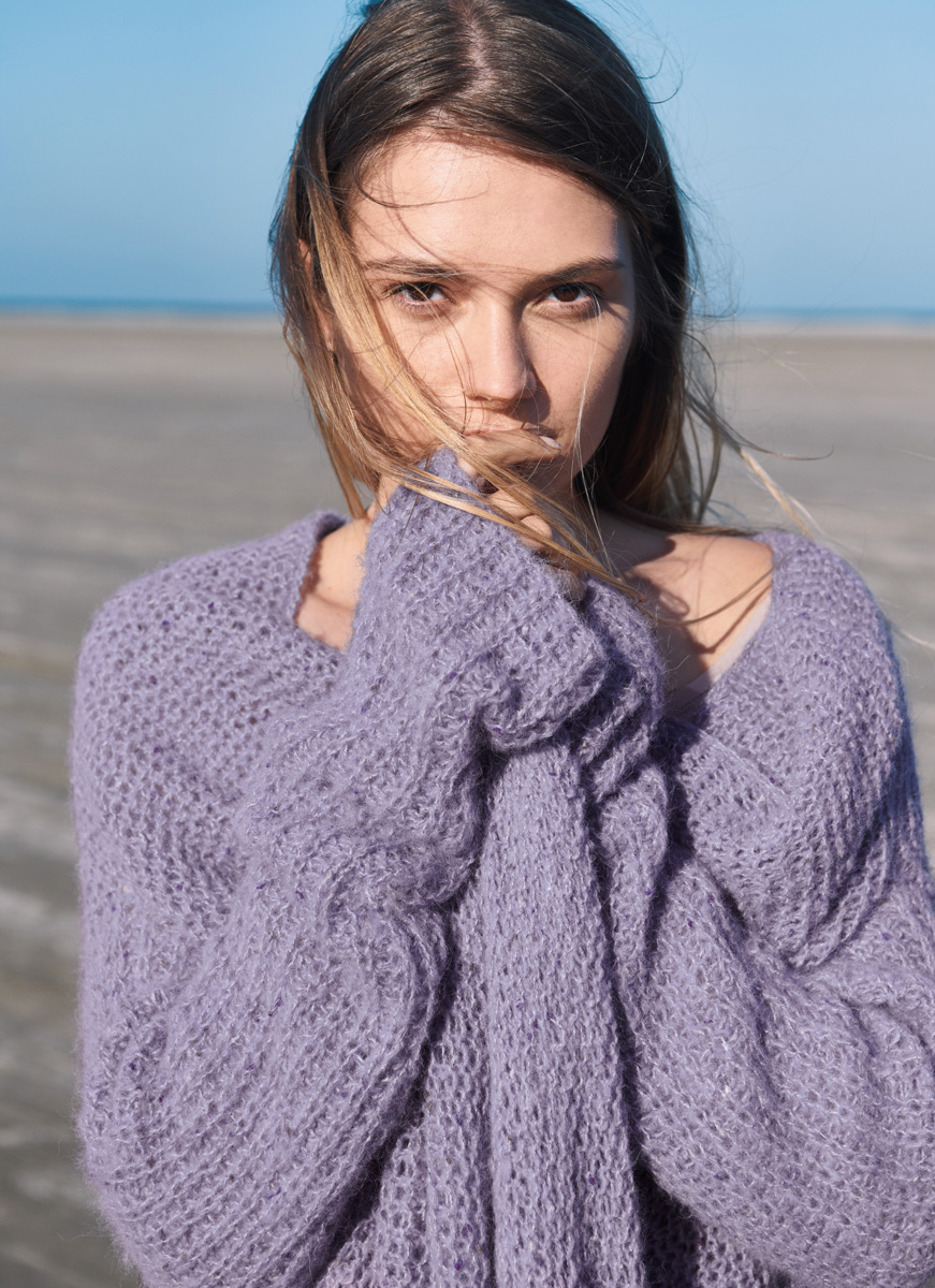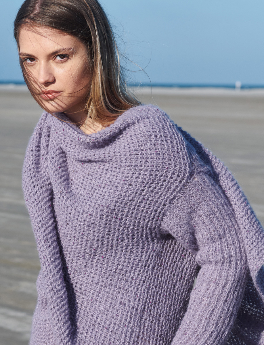 500 (550) g of Lana Grossa Peru Tweed (40% baby alpaca, 8% extrafine Merino wool; 32% viscose, 20% polyamide; 175 m/50 g) in Lilac (col 18). Size 5 and 7 mm circular needles, each 80 cm long; size 5.5 mm crochet hook