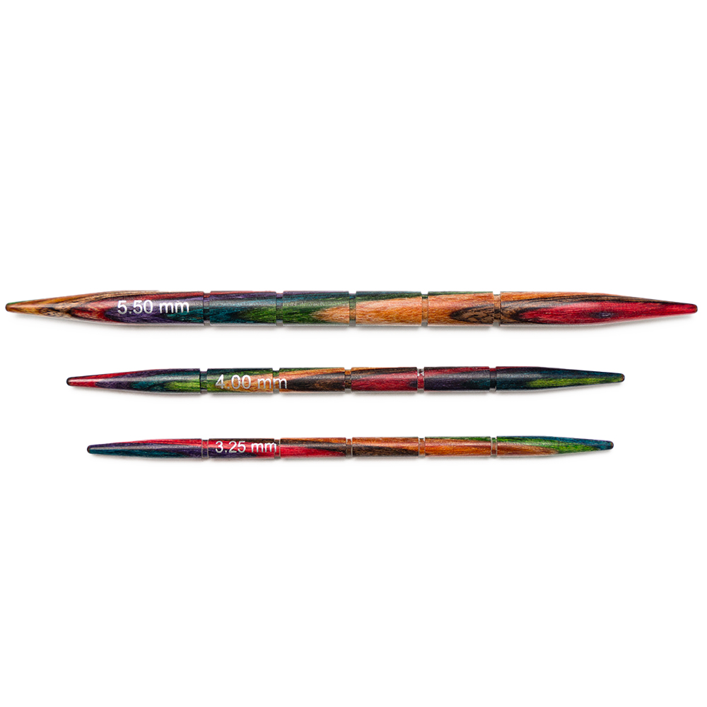 A set of three cable needles design wood in sizes 3.25 mm, 4.0 mm and 5.5 mm.