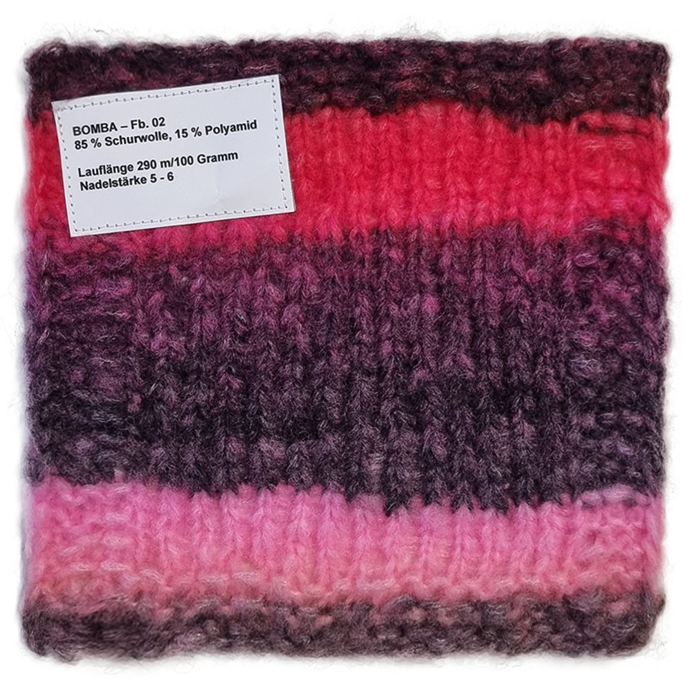Multicolored stripes and a fluffy, voluminous texture: Bomba print yarn ensures quick, striking knitting results. Ideal for beginners.