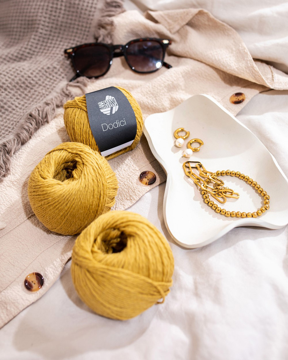 Dodici is a lightweight summer yarn with a lively texture and a pleasantly dry feel. The high-quality blend of cotton, viscose, and linen creates a soft fabric with a natural character and subtle sheen. Thanks to its textured surface, every knitted piece looks especially fresh, modern, and timeless.