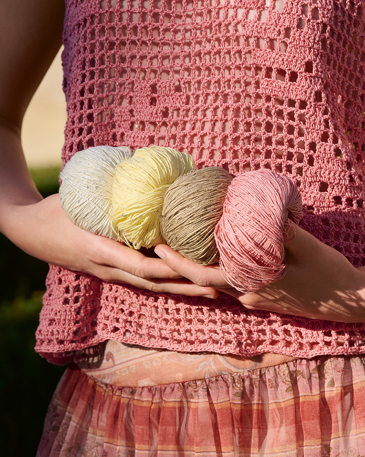 High-quality cotton threads are twisted together with a thread of tiny sequins to form a thin yarn. Dyed tone-on-tone, they create subtle shimmering highlights.