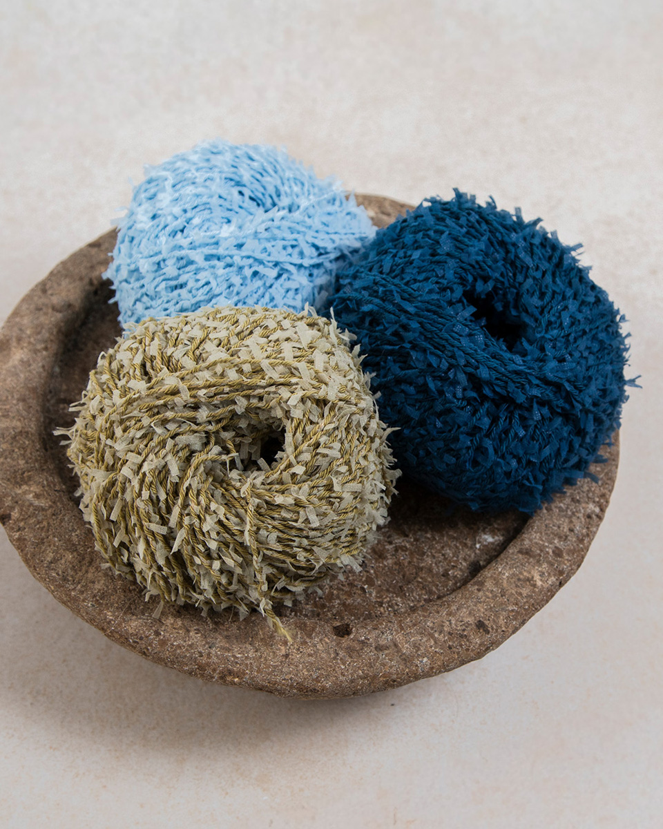 An effect yarn made of cotton threads and knotted paper strips, which creates fancy designs with its soft feel and lively appearance.