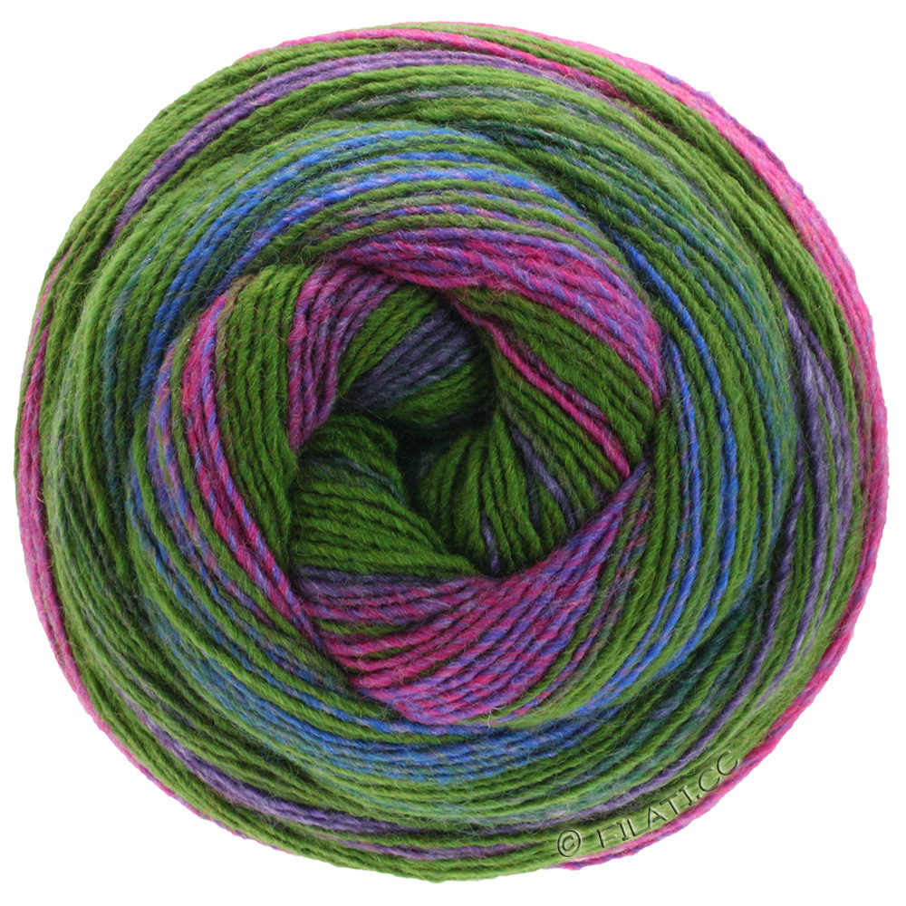 Slightly twisted yarn with colorful, harmonious color gradients, which are broken through by striking stripes