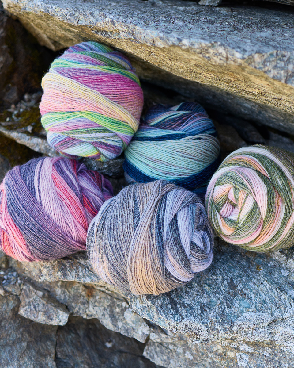 Single ply self-striping yarn creating wide, evenly spaced stripes.