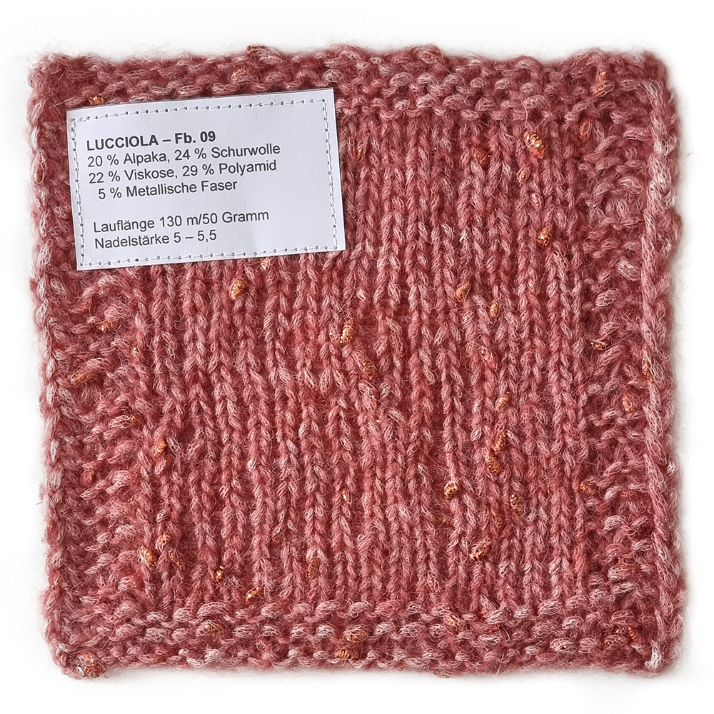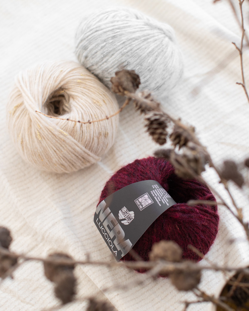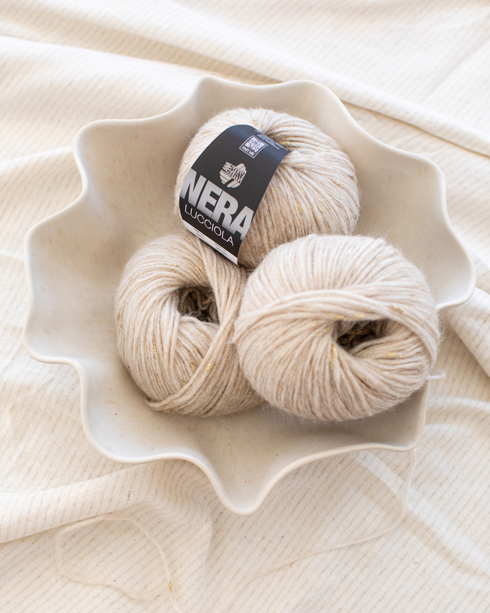 Lana Grossa Lucciola is a fine, shimmering yarn that adds an elegant touch to any knitting project. Its delicate metallic thread creates lively effects that shine particularly well in scarves, shawls, or festive tops. Light and pleasant to work with – perfect for modern, sophisticated knitwear with a hint of glamour.