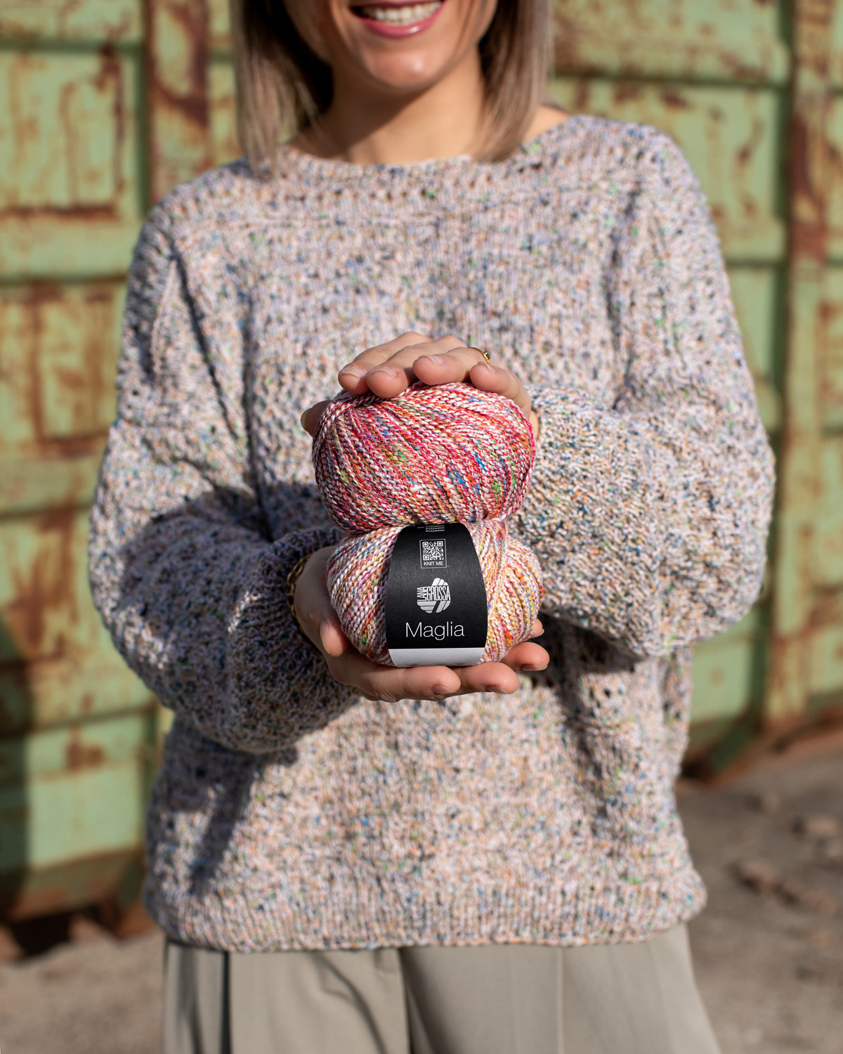 Maglia is a modern summer tweed yarn made from soft cotton, twisted with a colorful effect thread. This creates a lively, textured stitch pattern with subtle color variety—perfect for knitting projects with a natural feel and a fashionable touch. Light, breathable, and comfortable against the skin, Maglia is ideal for summer sweaters, tops, jackets, or accessories that shine with texture and color.