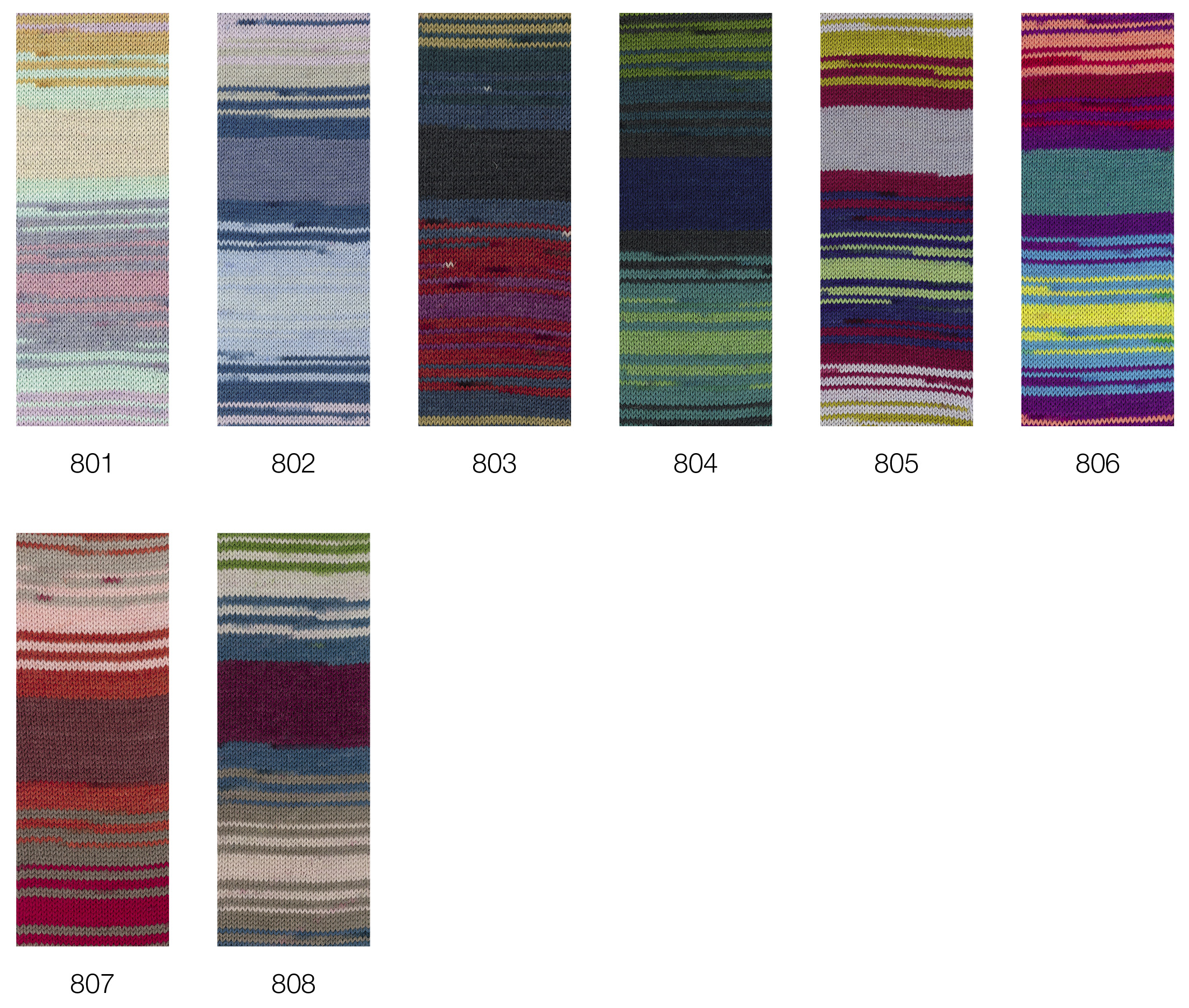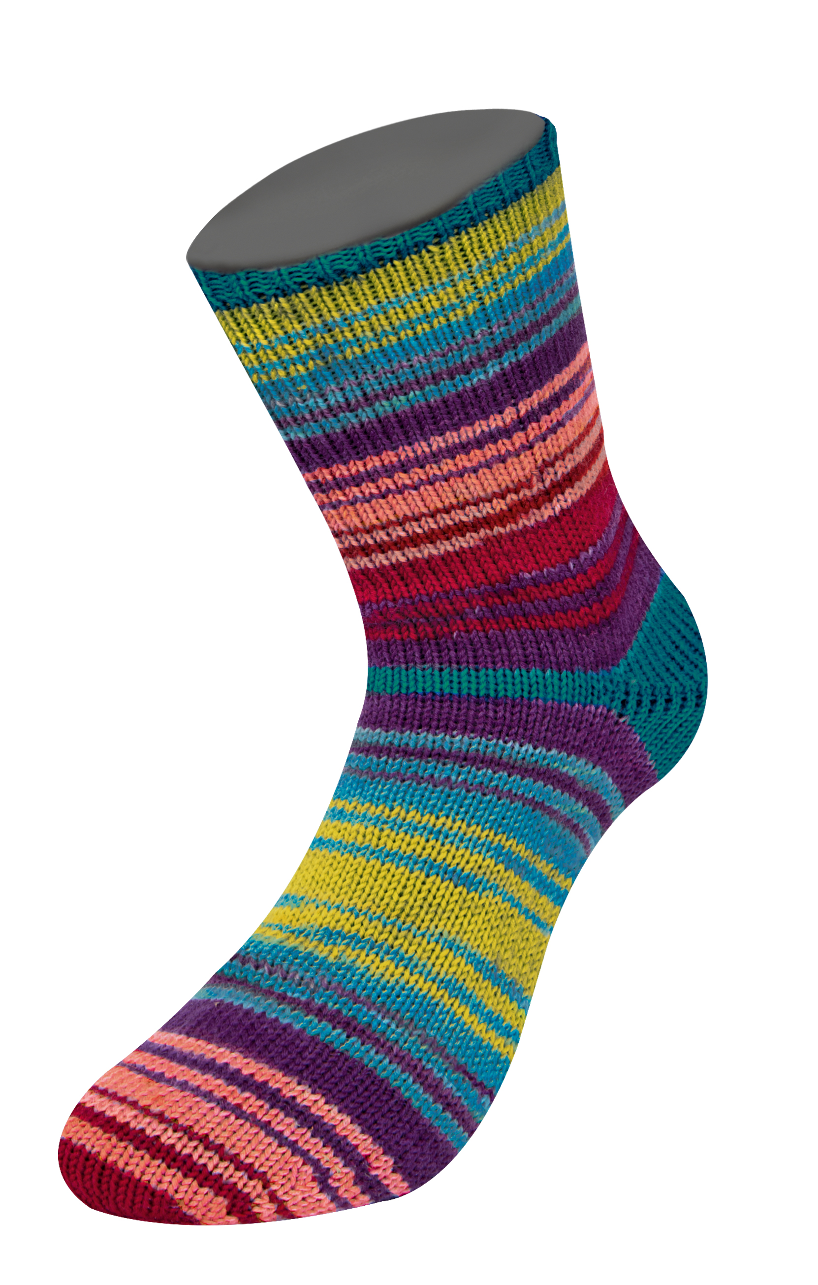 Each ball contains exactly the same color gradient twice, the beginning and the transition are marked with a contrast thread, so you get two identical socks without searching and unwinding; with quick start