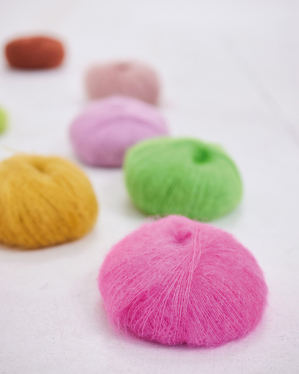 Silkhair is Lana Grossa’s beloved lace yarn – a luxurious blend of superkid mohair and silk, admired for its lightness, subtle sheen, and elegant fluff. Perfect for delicate shawls, sweaters, airy cardigans, or as a companion yarn for refined effects. Knit it solo for a transparent, airy result or double-stranded for extra volume – Silkhair lends every project an exclusive, feminine touch.