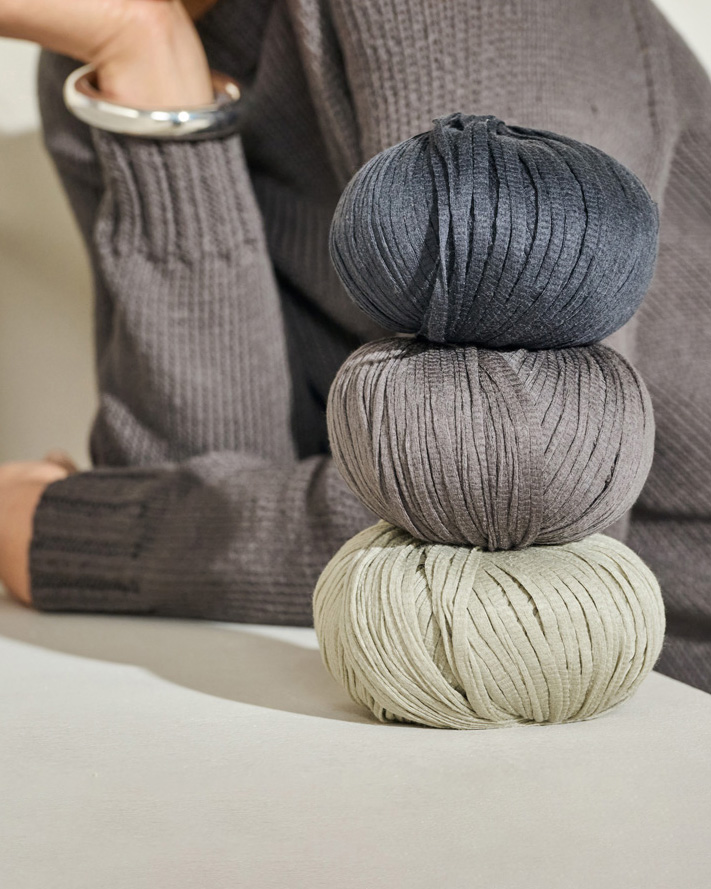 Delicate cotton fibers are processed into a fine ribbon yarn for this yarn, whose matte, paper-thin appearance gives it an unmistakably clean character.