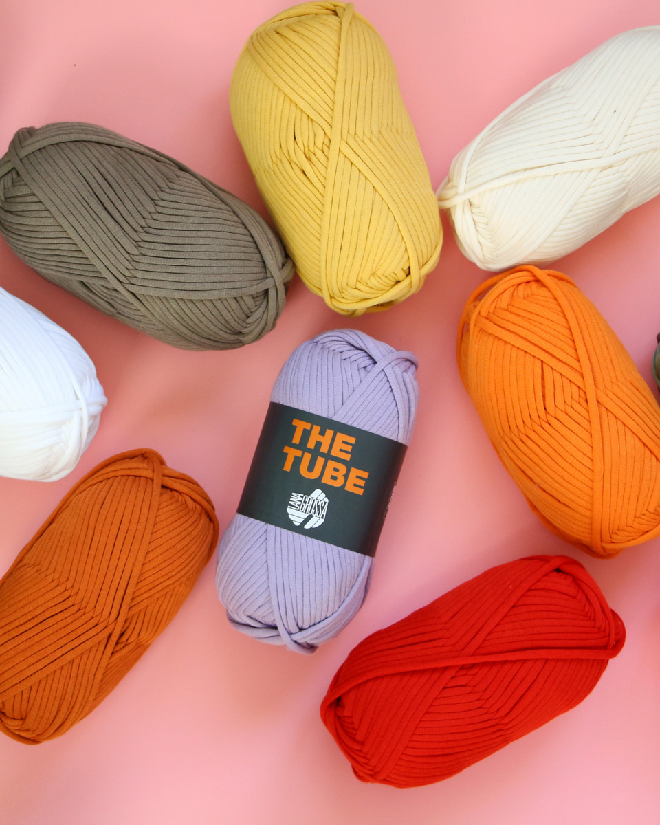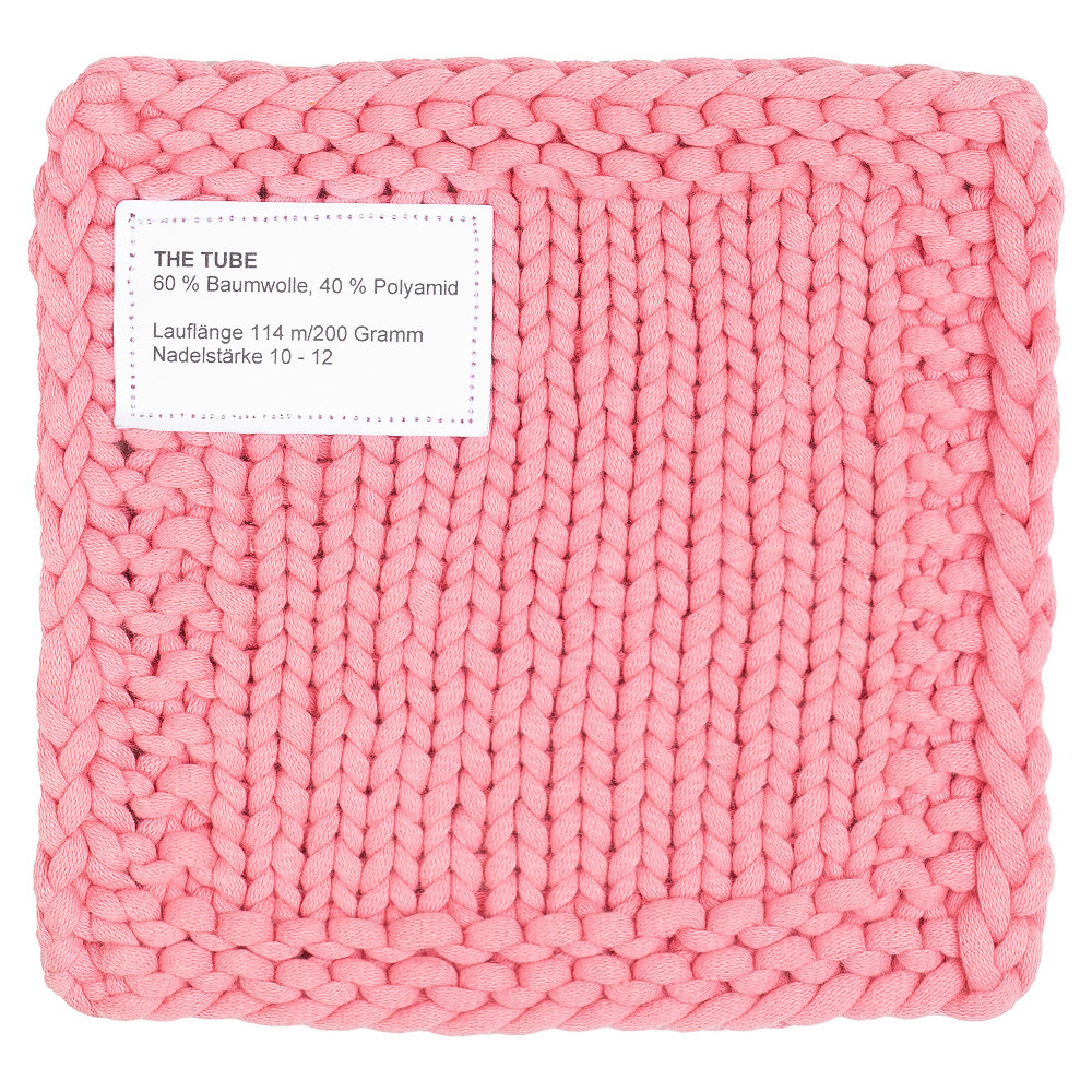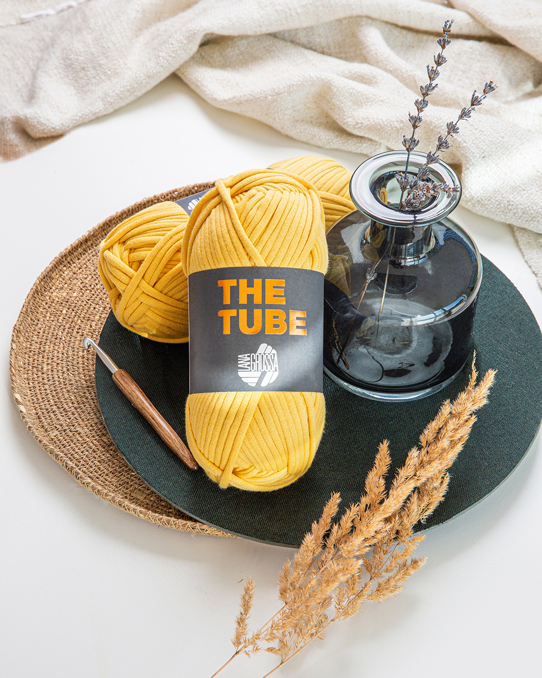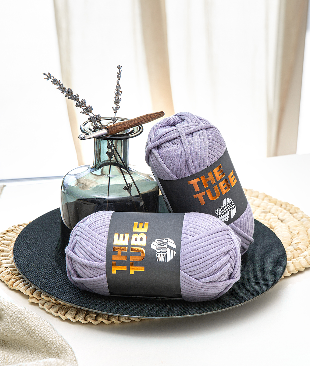 The Tube is a voluminous tubular yarn with a modern look and soft feel. The outer cotton shell encases a light, airy core, making the yarn especially stable in shape, lightweight, and pleasantly soft. Ideal for accessories, bags, home décor, or trendy oversized pieces that require both structure and support.