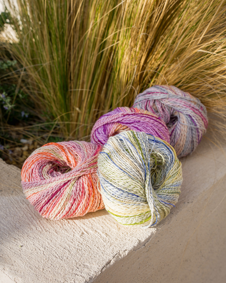 Cotton yarn with irregular color effects, wrapped with a shimmery thread.