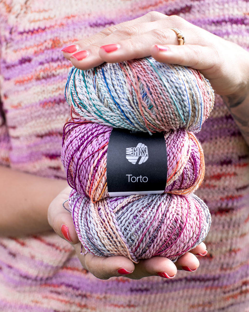 Torto is a creative cotton effect yarn with a double color effect: the base thread features a gentle mélange gradient, which is irregularly wrapped with a fine, shiny thread. This creates a lively, textured stitch pattern with subtle sheen and natural depth.
